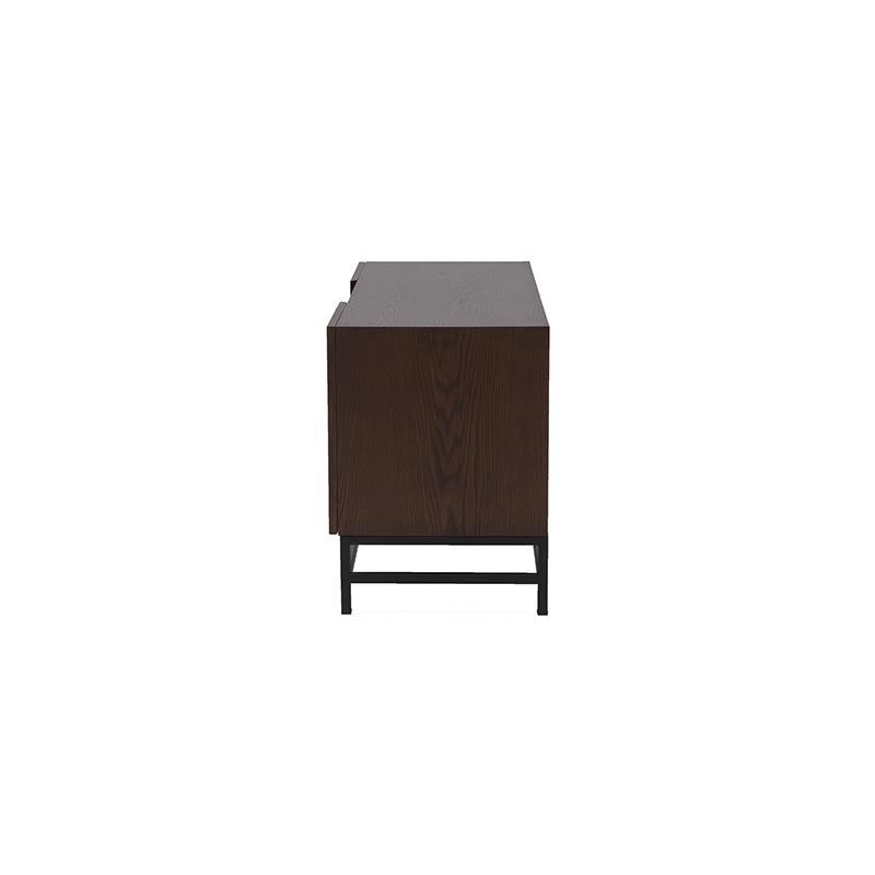 Con un elegante acabado enchapado en encino color nogal y robustas patas negras metálicas, este mueble aporta un aire sofisticado que realza cualquier sala moderna.