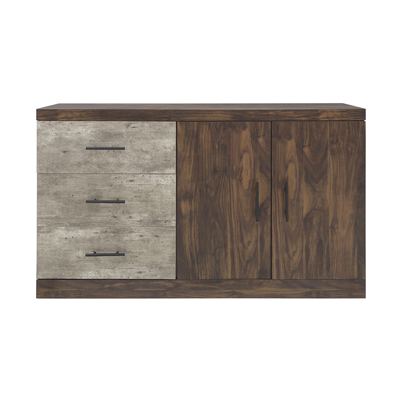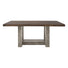 La mesa de comedor Amara destaca con su cubierta de madera de nogal y pedestal en acabado gris concreto, ofreciendo un diseño moderno y resistente que se adapta a cualquier ambiente.