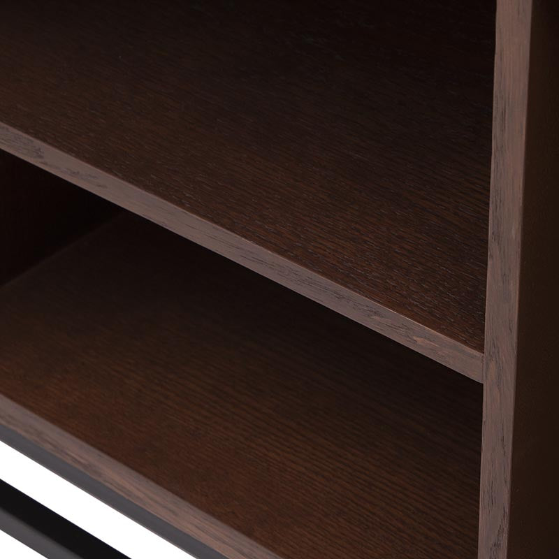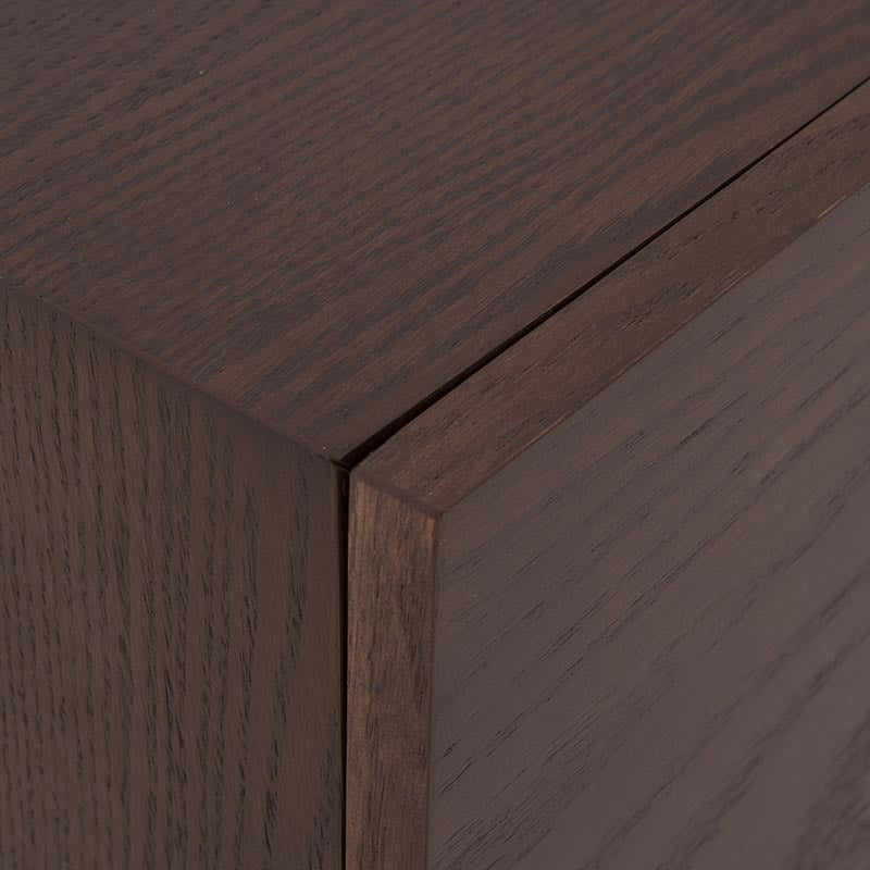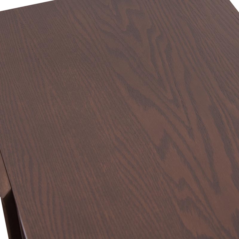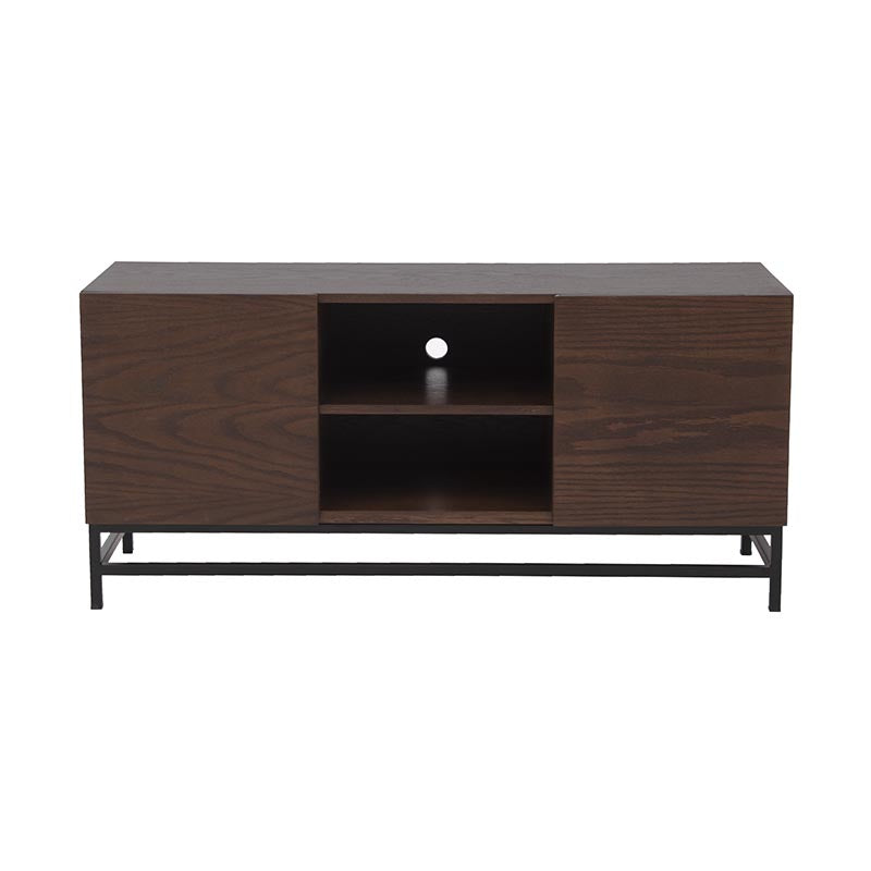 Con un elegante acabado enchapado en encino color nogal y robustas patas negras metálicas, este mueble aporta un aire sofisticado que realza cualquier sala moderna.