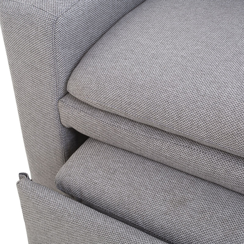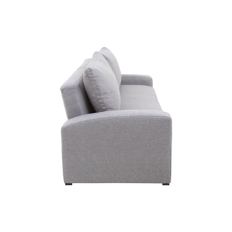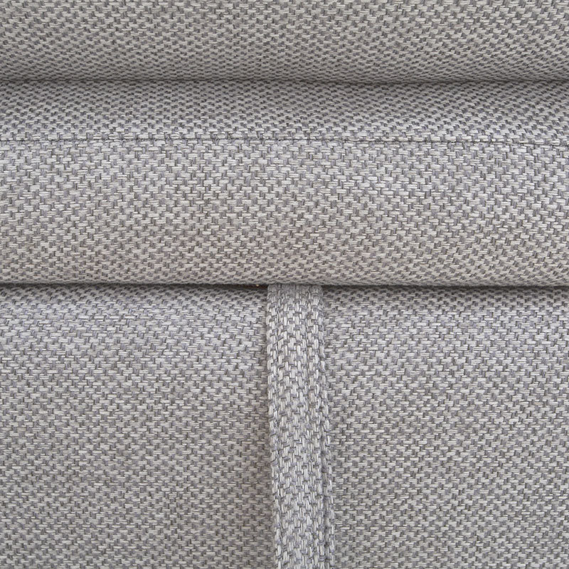 Su tapizado en tela plana afelpada en tono gris oxford transmite elegancia atemporal, mientras que su sólida estructura asegura comodidad tanto de día como de noche.