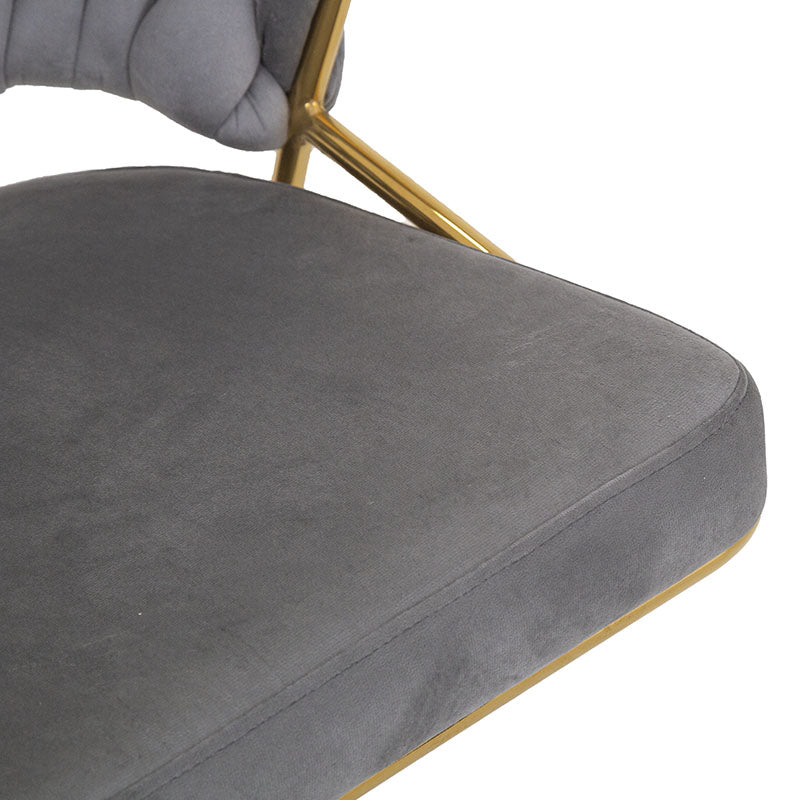 El tapizado en suave terciopelo ofrece una textura agradable al tacto, mientras que su estructura metálica garantiza firmeza y durabilidad sin perder ligereza visual.