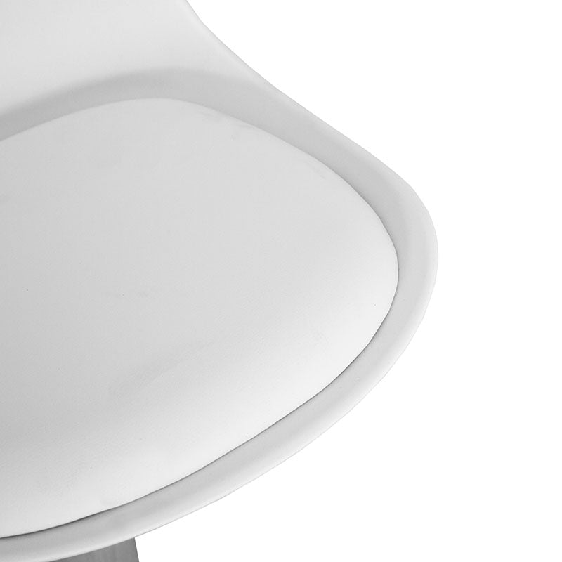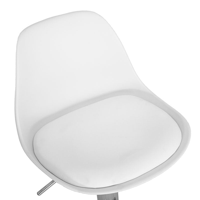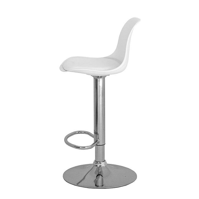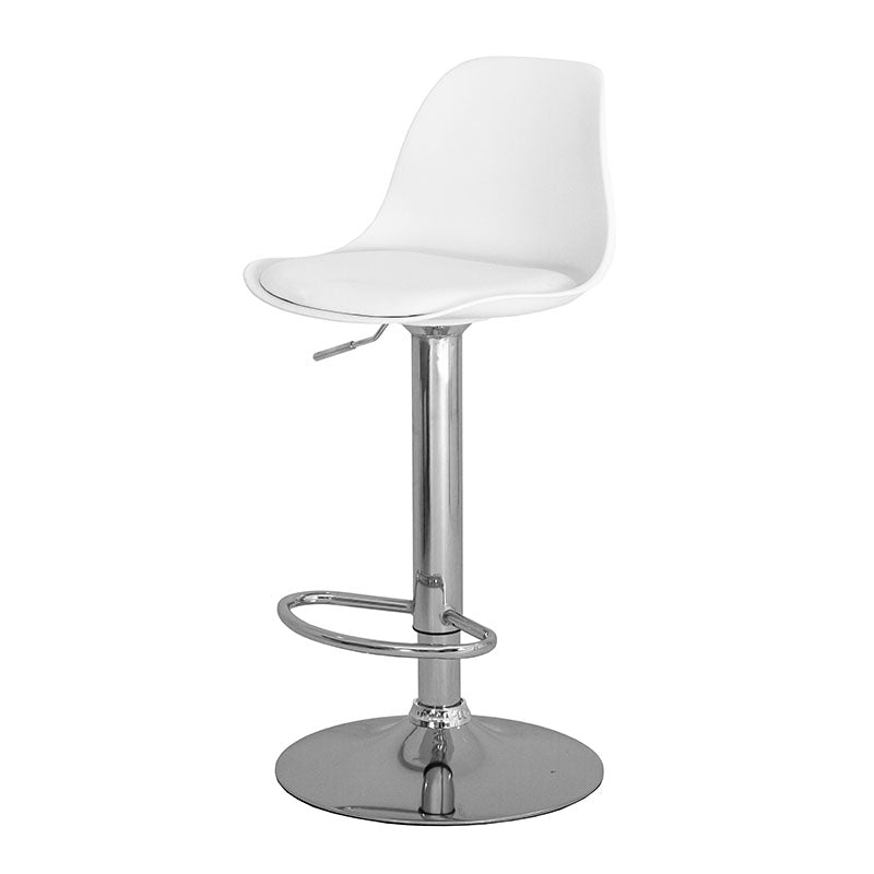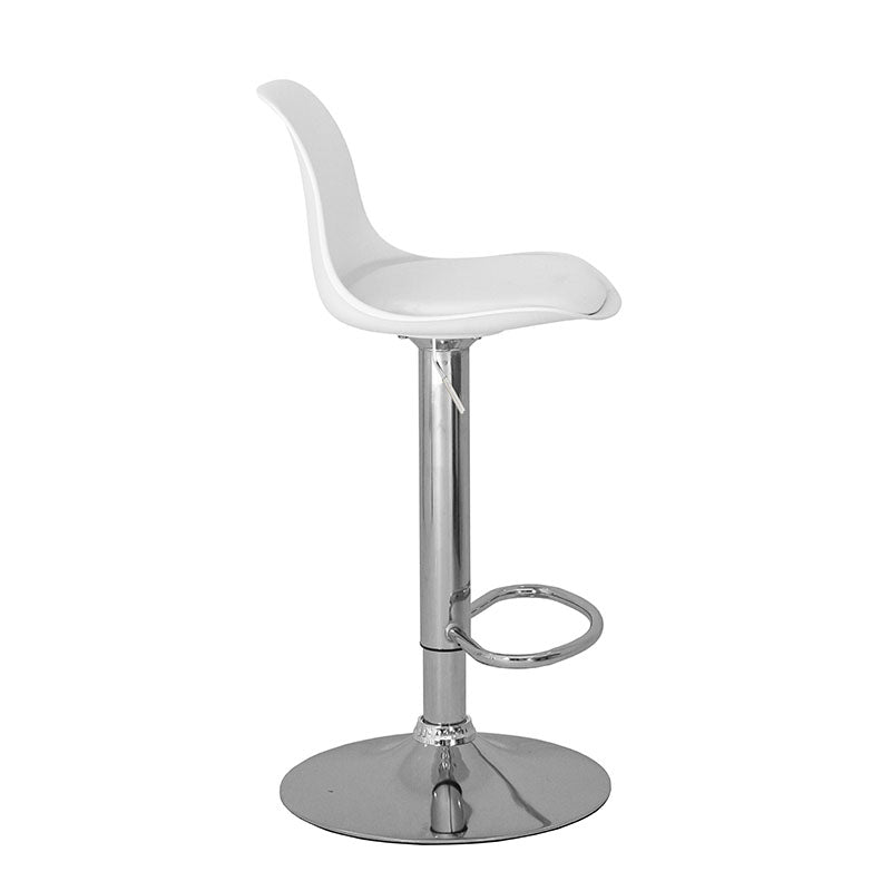 Tapizado en Leather Touch color blanco, ofrece una textura suave al tacto y una sensación de confort superior, ideal para acompañar barras, cocinas o espacios modernos. Su base metálica en cromo plata aporta un brillo sutil y una estructura firme que garantiza estabilidad y durabilidad, al mismo tiempo que realza su aspecto sofisticado.