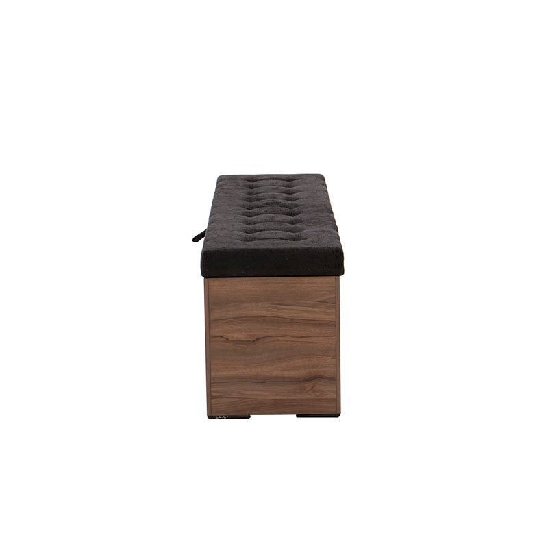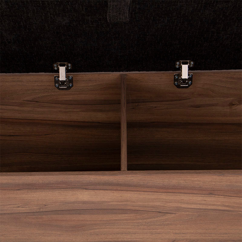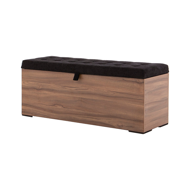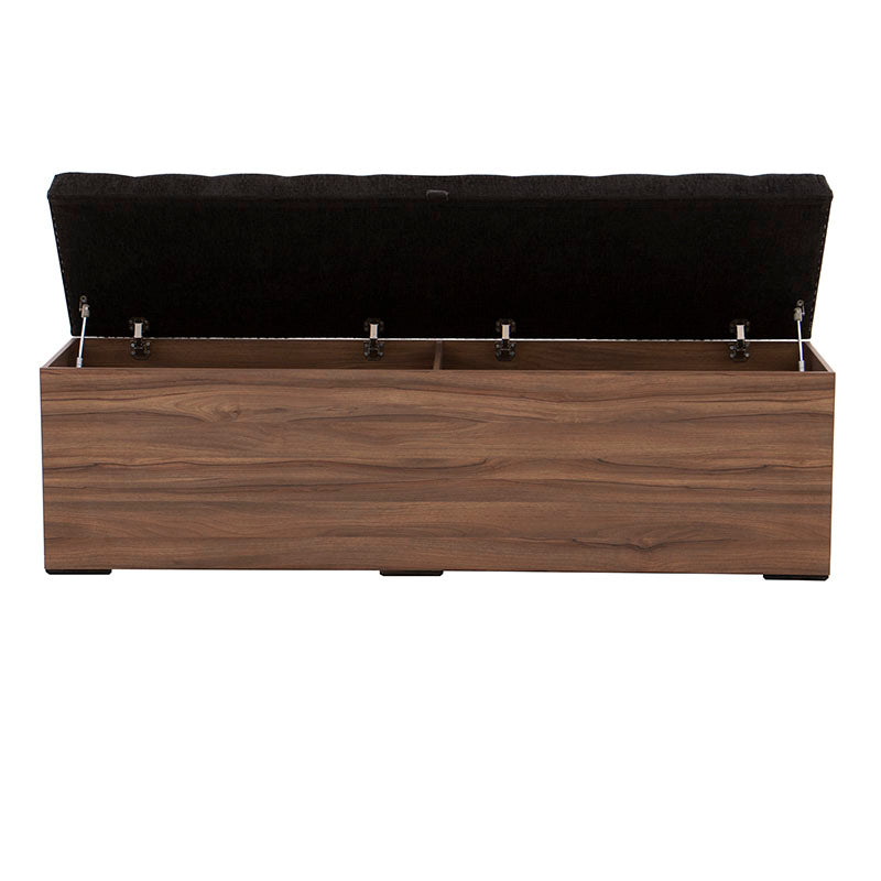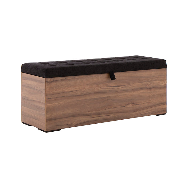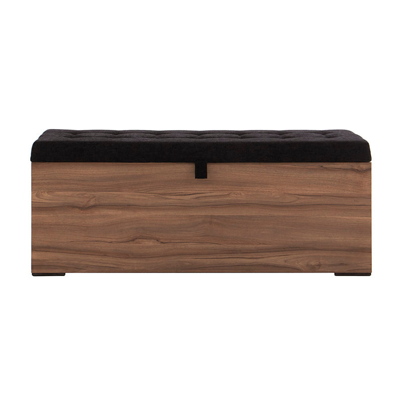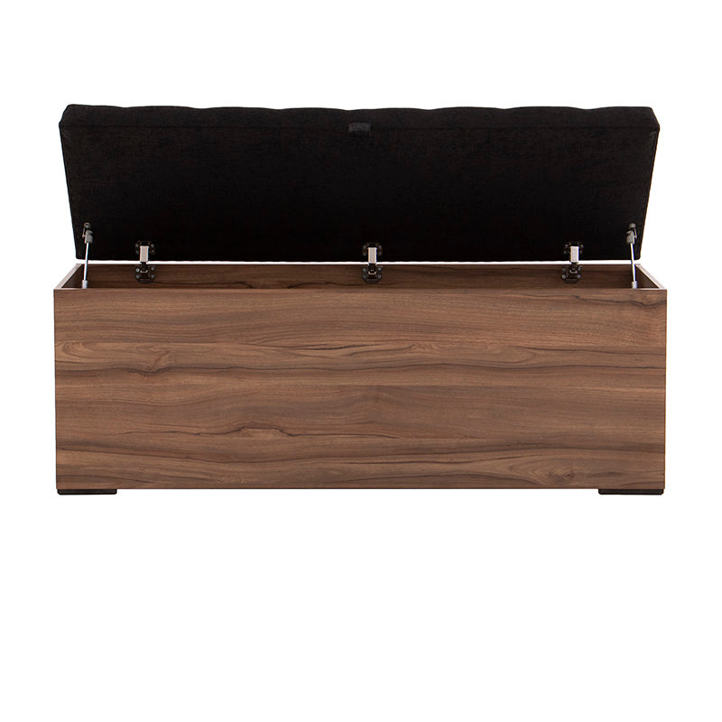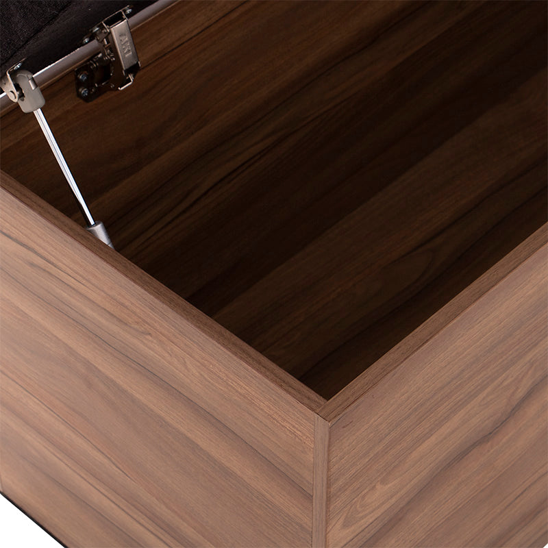 Fabricada en melamina color nogal, proyecta un acabado cálido y elegante, mientras que su cubierta tapizada en tela negra aporta un contraste sofisticado y contemporáneo.