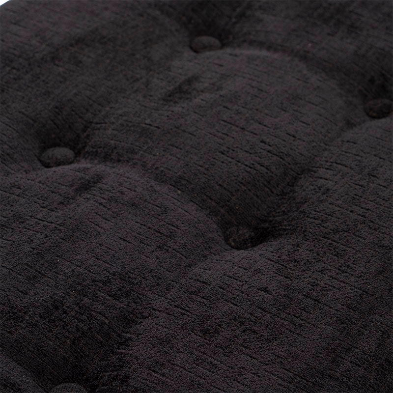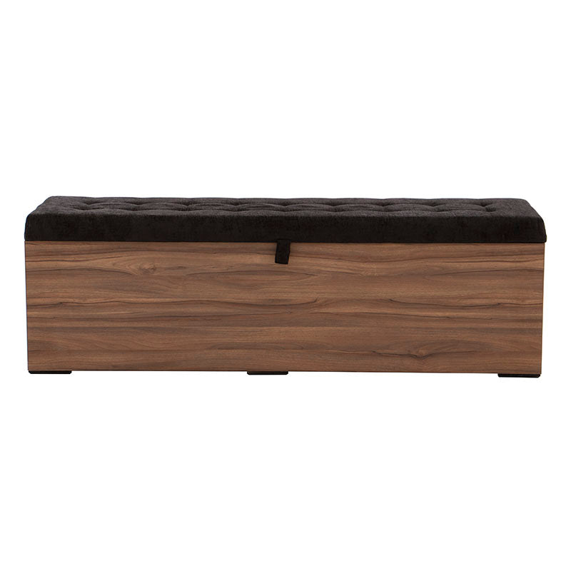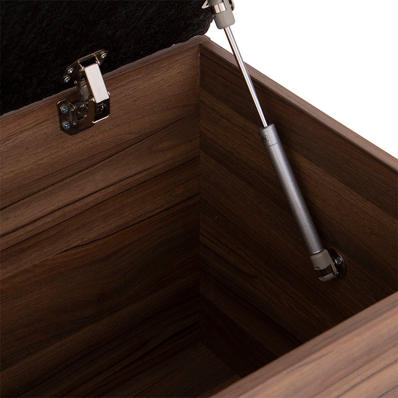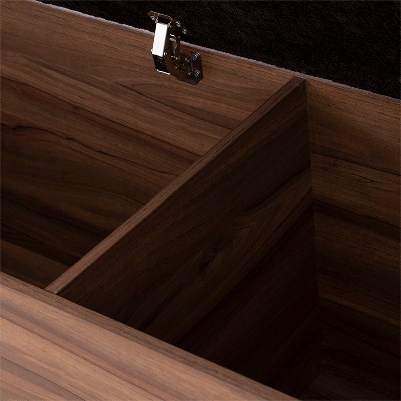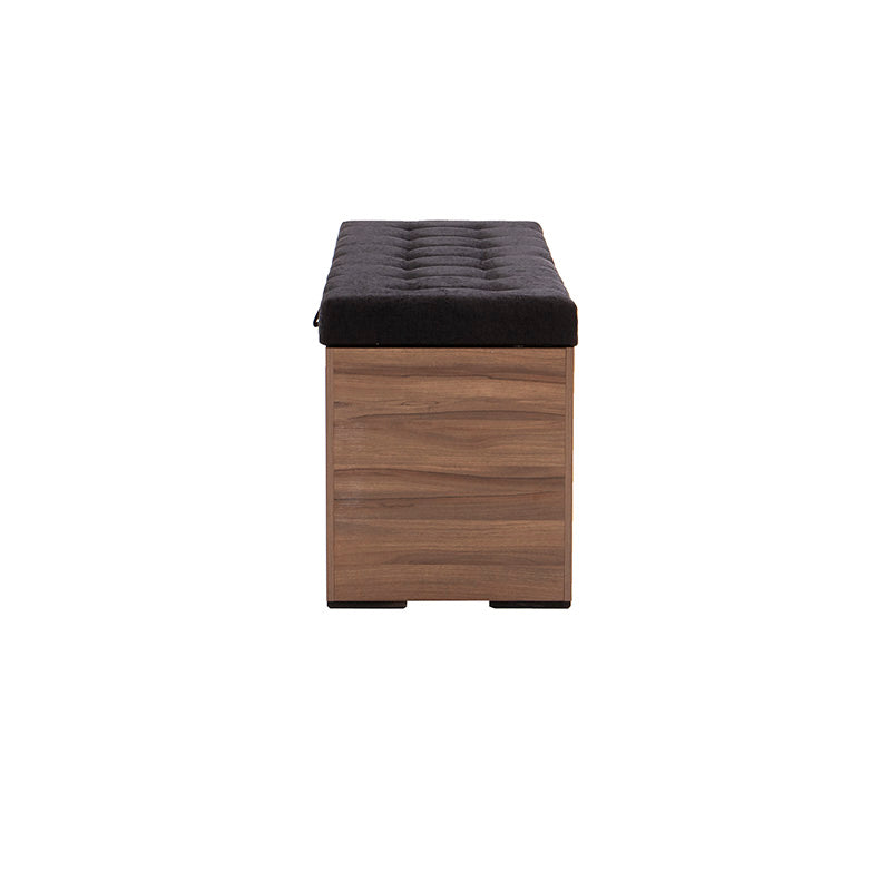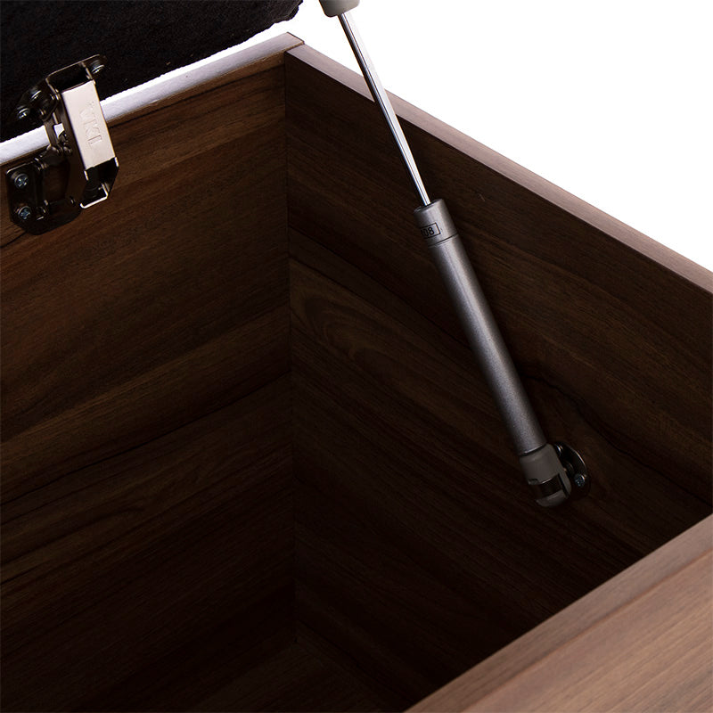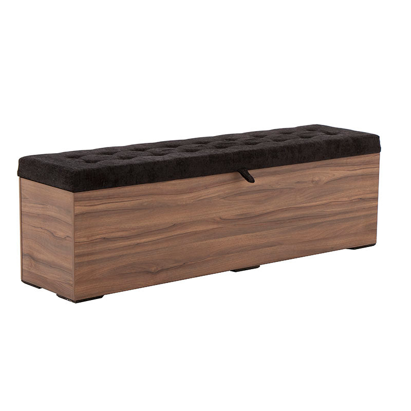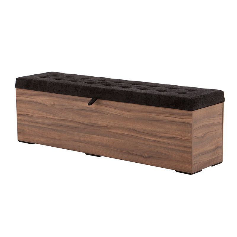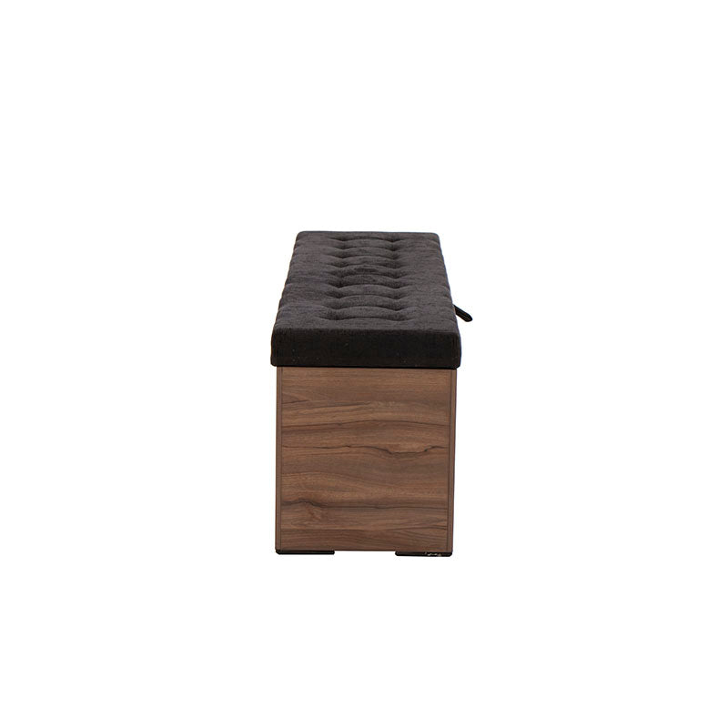 Fabricada en melamina color nogal, proyecta un acabado cálido y elegante, mientras que su cubierta tapizada en tela negra aporta un contraste sofisticado y contemporáneo.