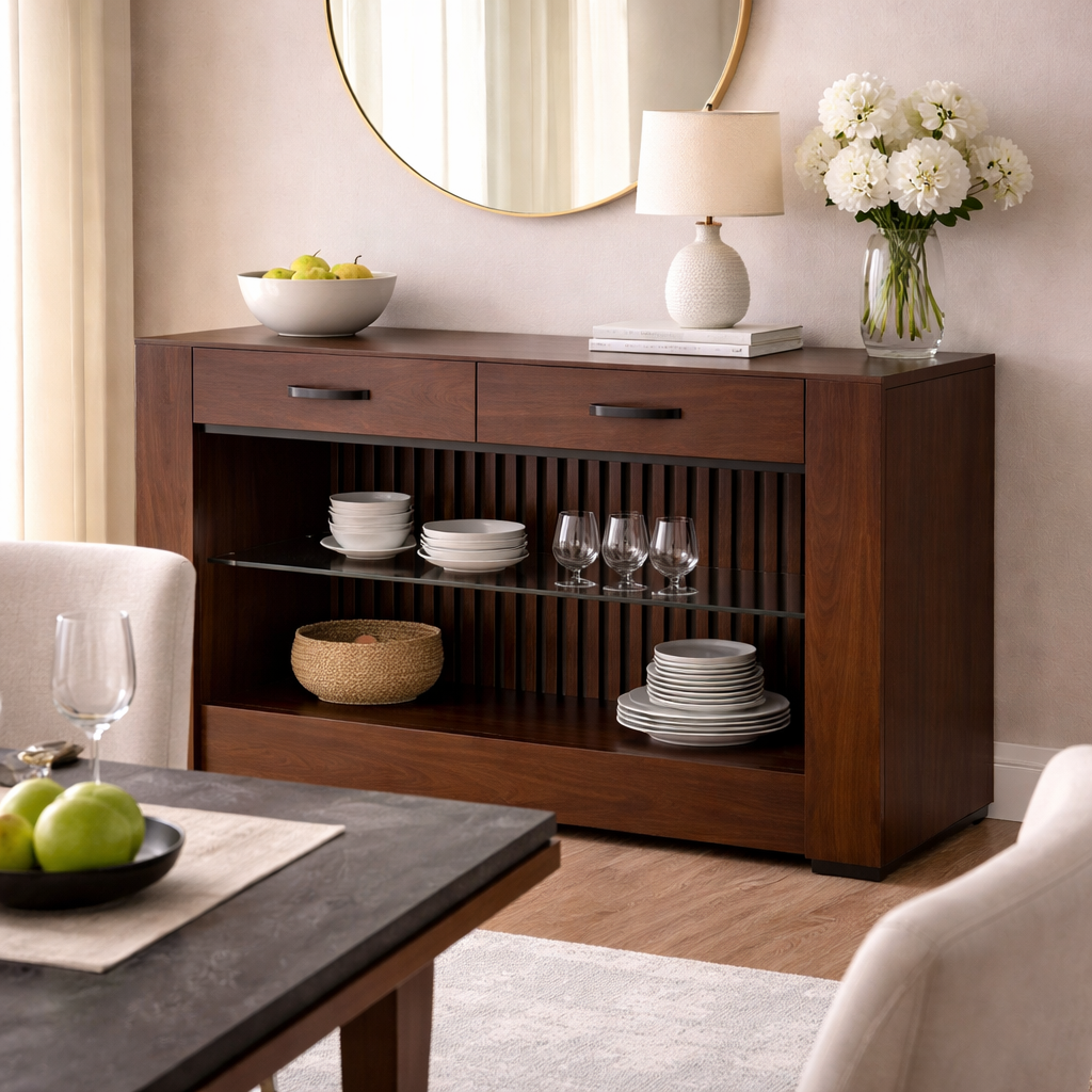 El Buffet Bourbon complementa tu comedor con funcionalidad y diseño sofisticado. Fabricado en madera de pino estufado con enchapado en tzalam, ofrece amplio espacio de almacenamiento y un acabado elegante que armoniza perfectamente con el estilo contemporáneo de la colección Bourbon.