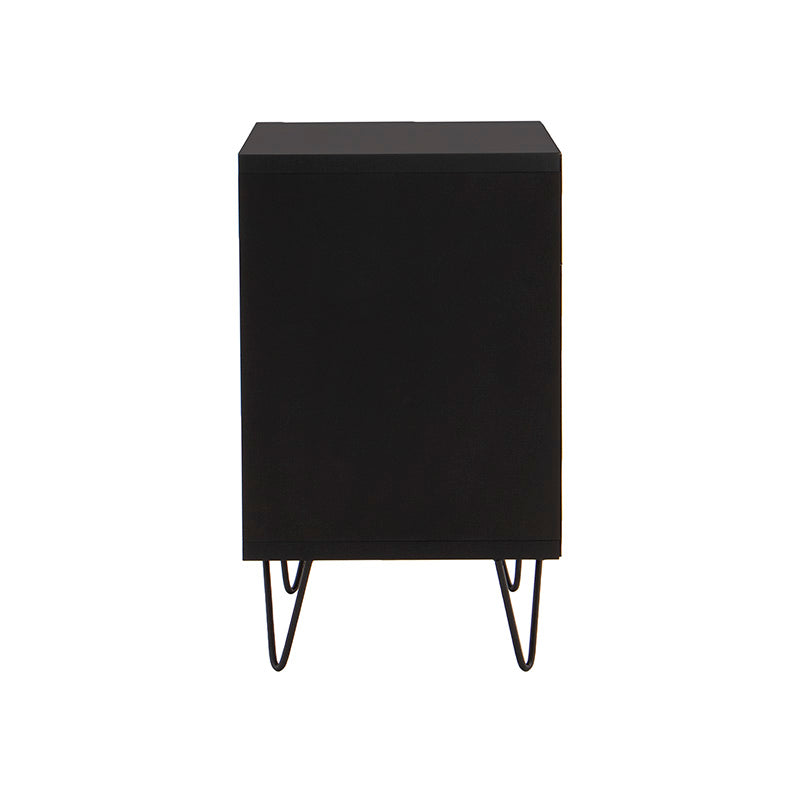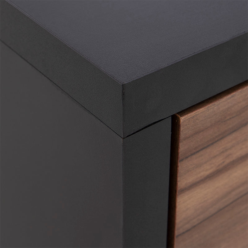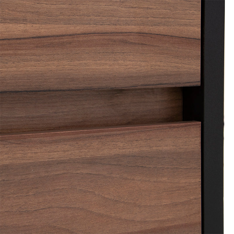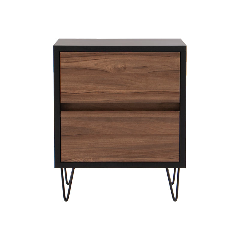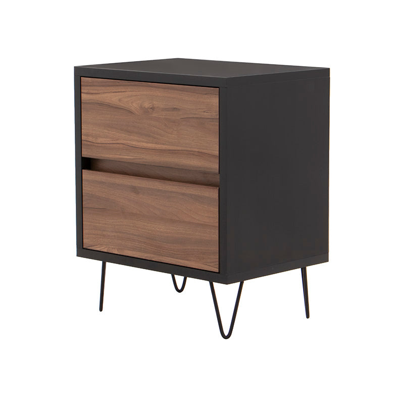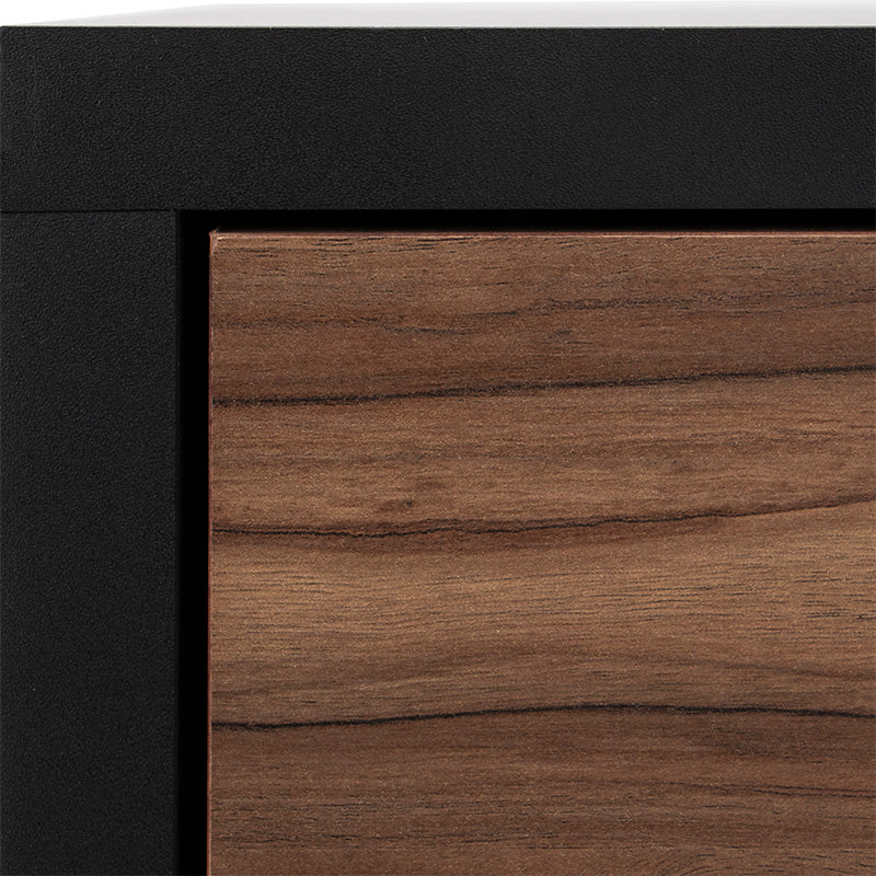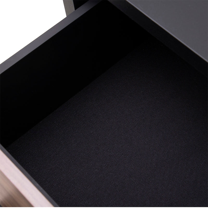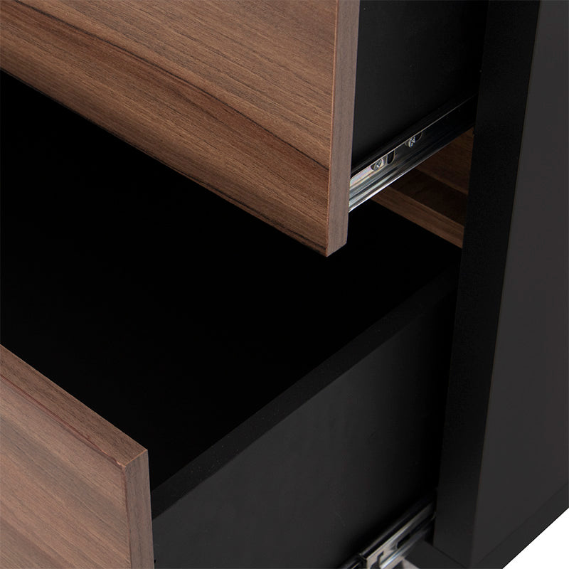 Su estructura en melamina color negro aporta sofisticación, mientras que el cajón en acabado nogal brinda un contraste natural y acogedor.