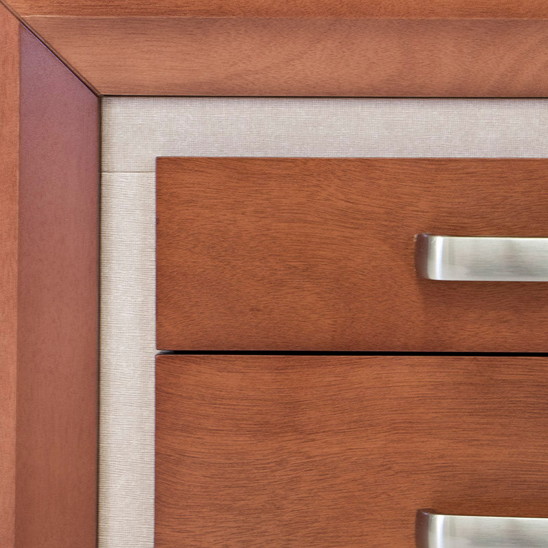 Descubre la elegancia eterna del Buró Siena, con su estilo contemporáneo que aporta armonía a tu entorno. La robusta estructura de madera sólida brinda durabilidad y resistencia. Su acabado enchapado en encino y okume natural, junto con la sutil franja de tapiz, crean una fusión única de texturas.