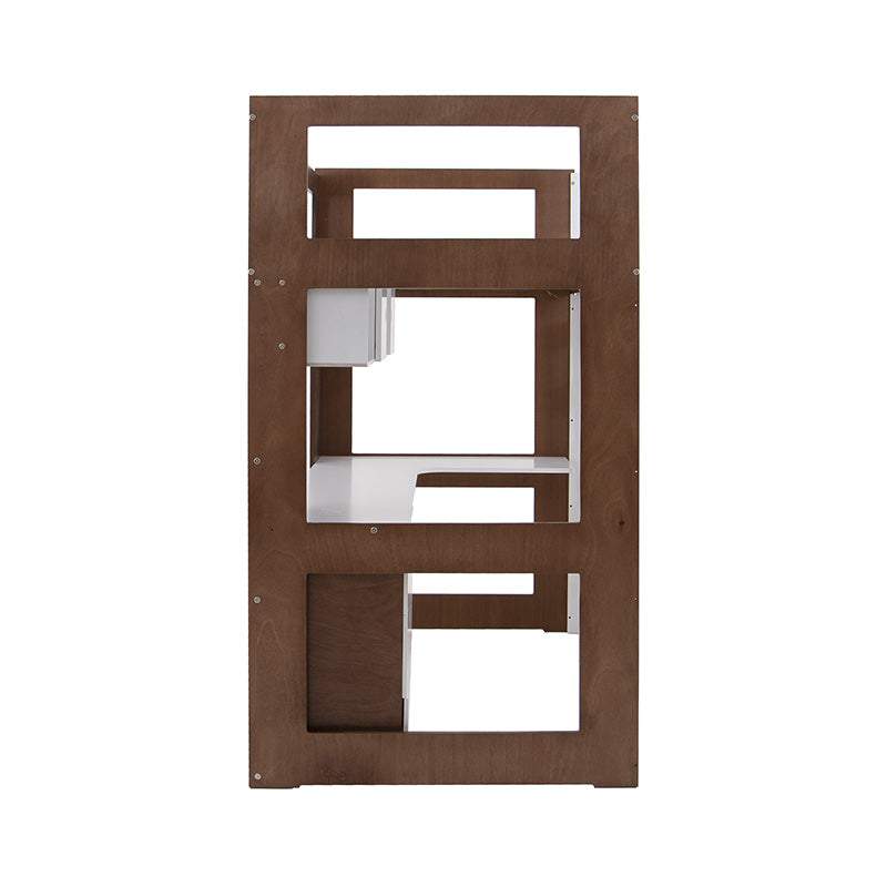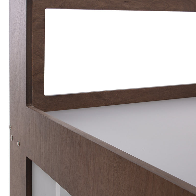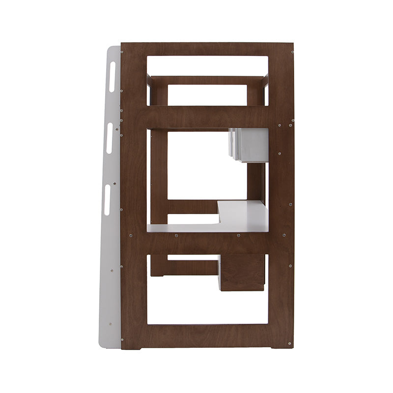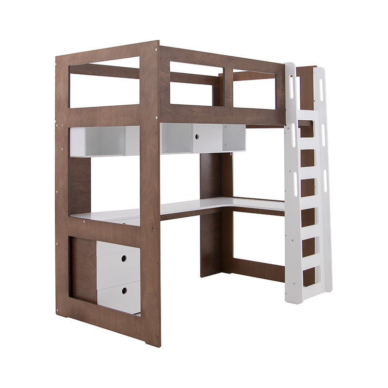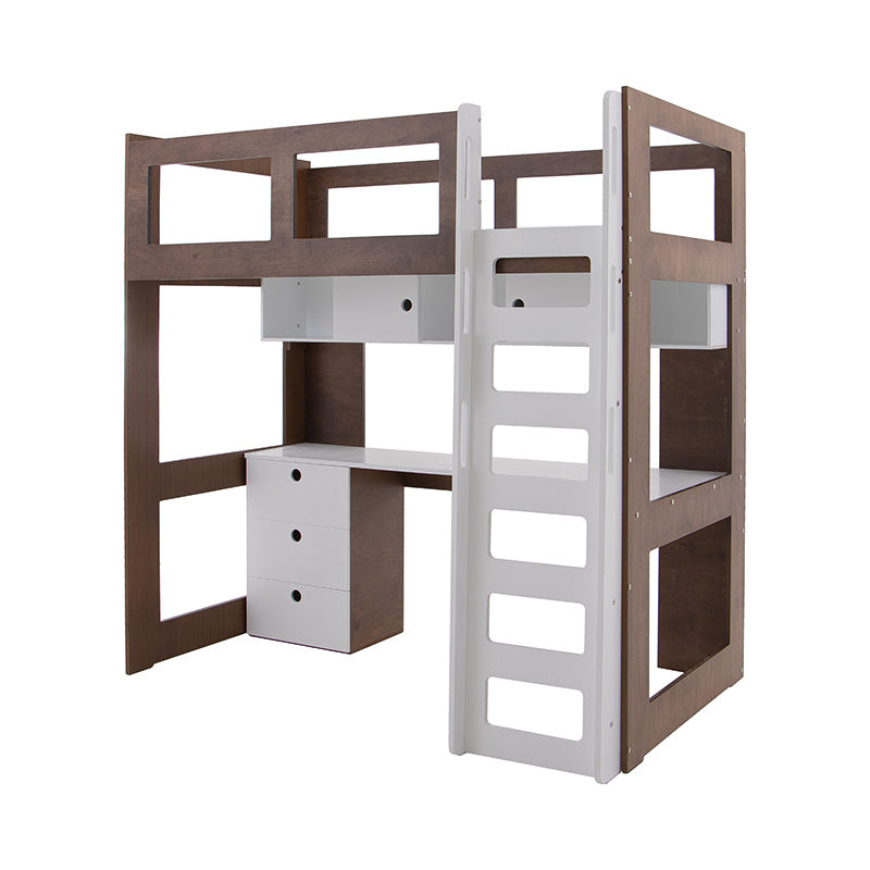 Su estructura elevada permite aprovechar el espacio al máximo, integrando un práctico escritorio y un librero que facilitan la organización y el almacenamiento sin sacrificar estética.
