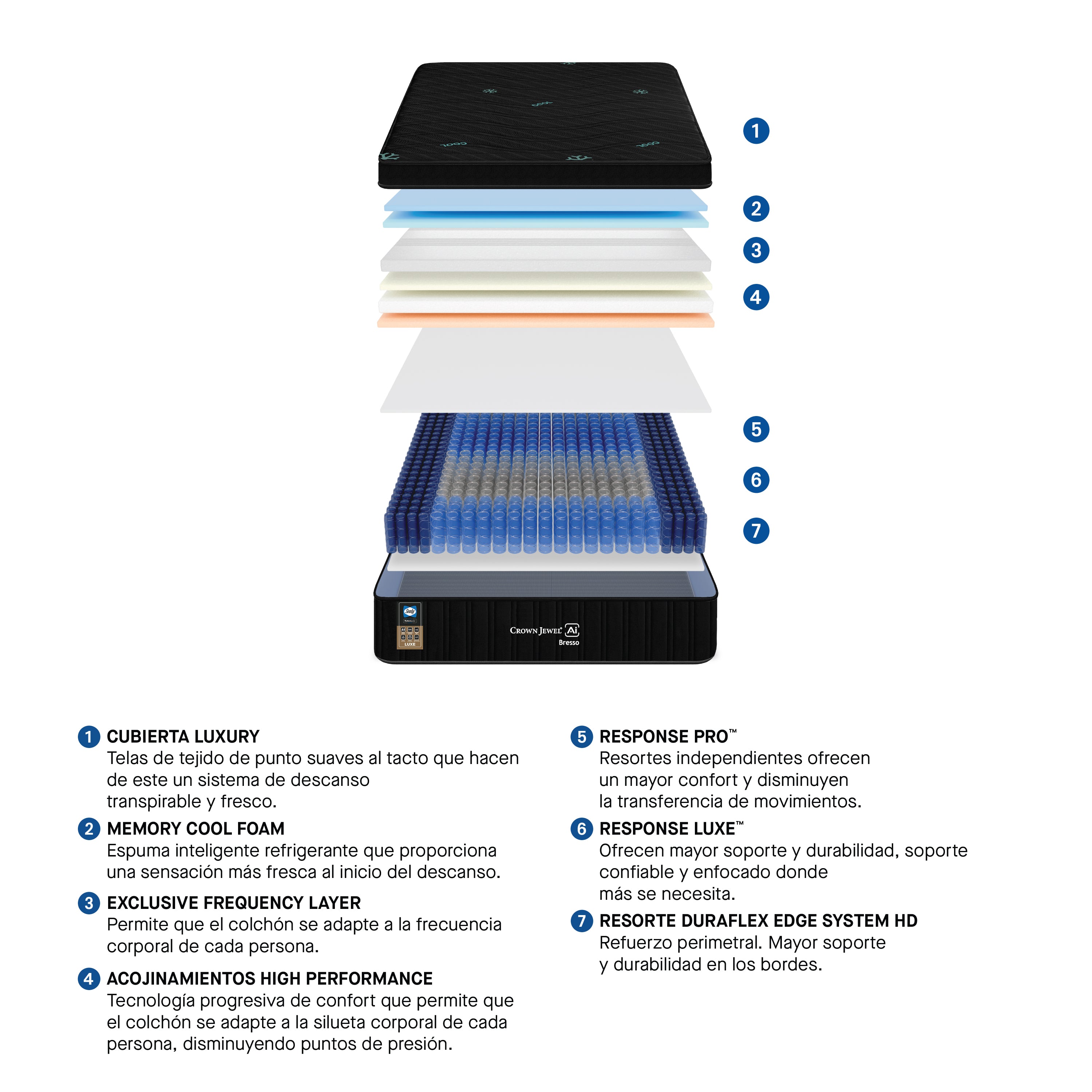El conjunto Bresso combina lo mejor de la innovación y el lujo para ofrecer un descanso verdaderamente reparador. Su tecnología avanzada y materiales de alto rendimiento trabajan en armonía para adaptarse al cuerpo, aliviar la presión y mantener una temperatura ideal durante toda la noche.