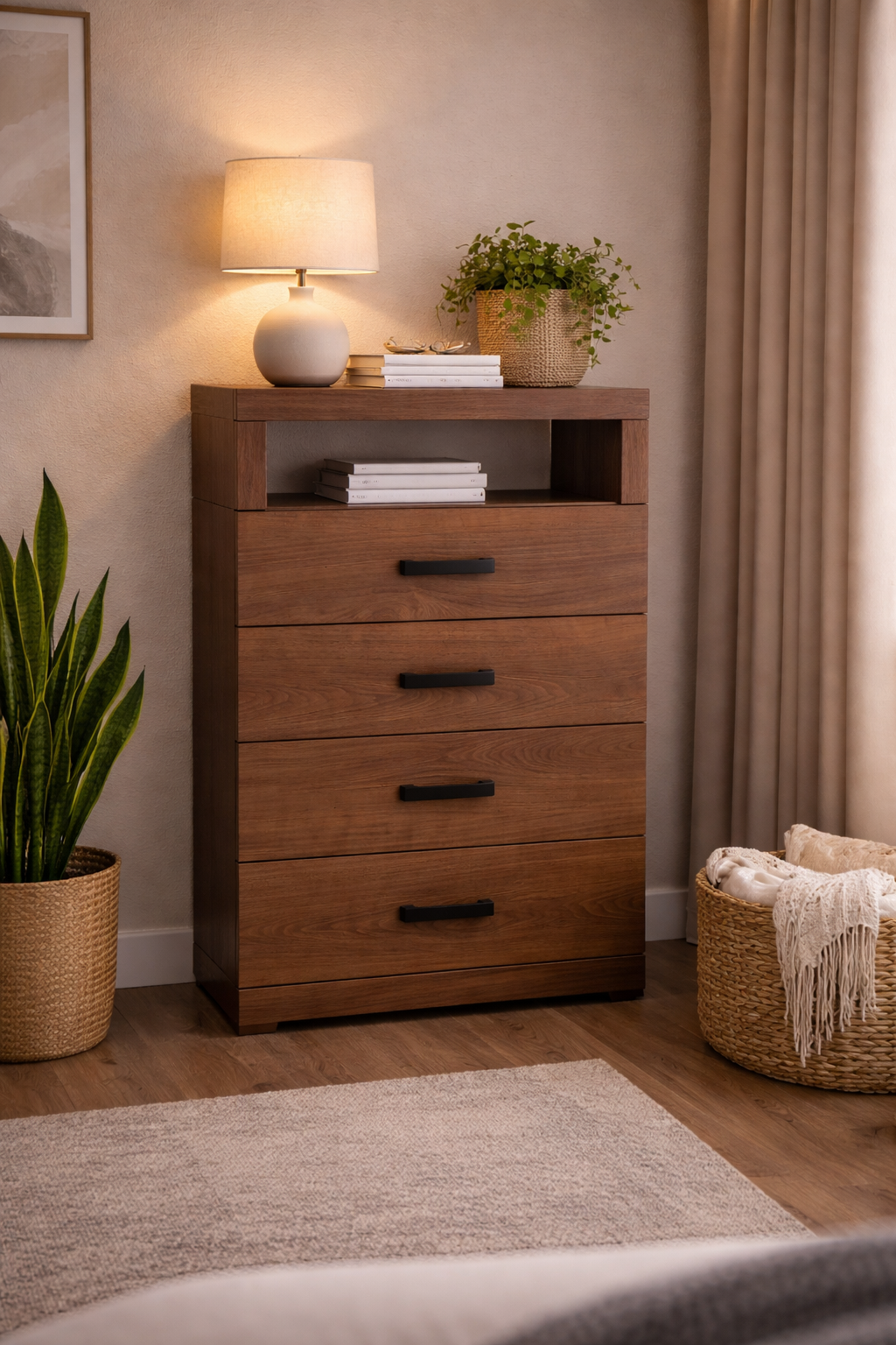 La Cómoda Alejandría destaca por su diseño contemporáneo y su estructura resistente en MDF procesado. Pintada, veteada y laqueada con secado en horno UV, ofrece durabilidad y excelente acabado. Sus cajones cuentan con correderas tipo cisne que garantizan un deslizamiento suave y eficiente, brindando almacenamiento práctico sin perder elegancia.