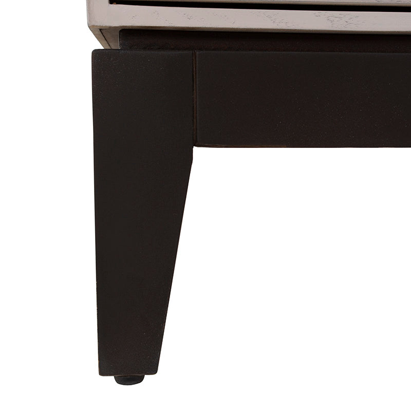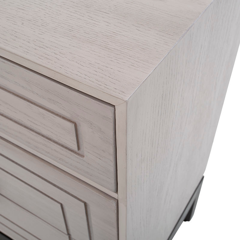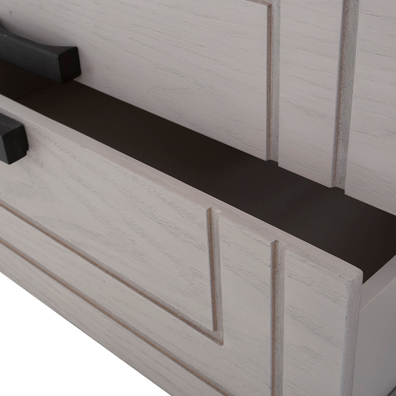 Elaborada con madera de pino y acabados enchapados en encino gris, esta pieza aporta un aire sofisticado y atemporal a tu recámara.