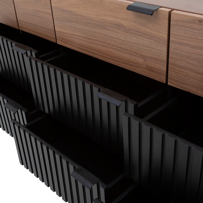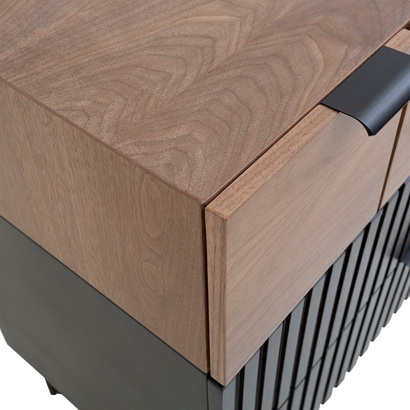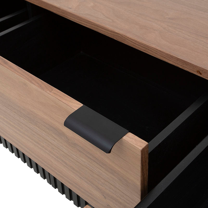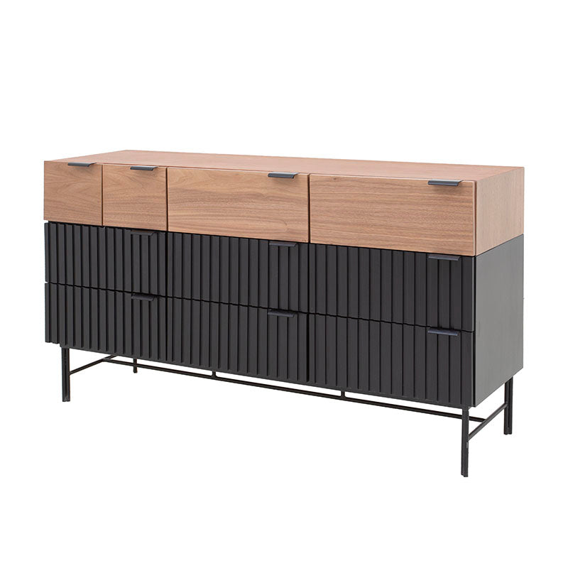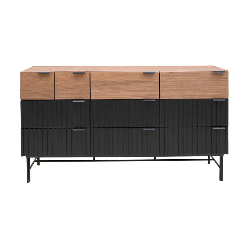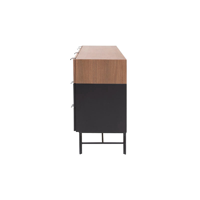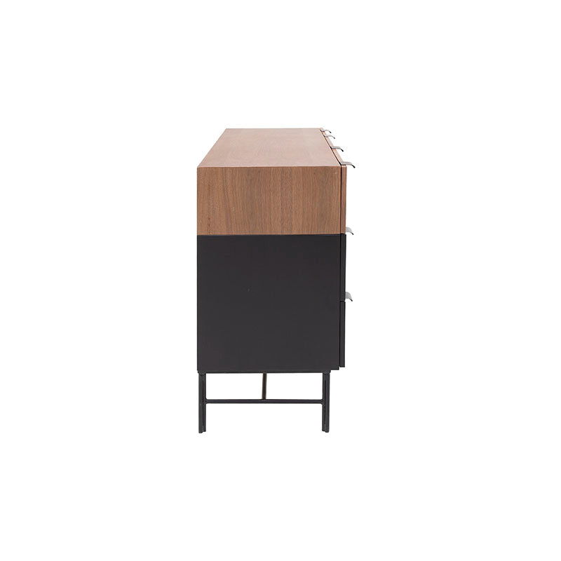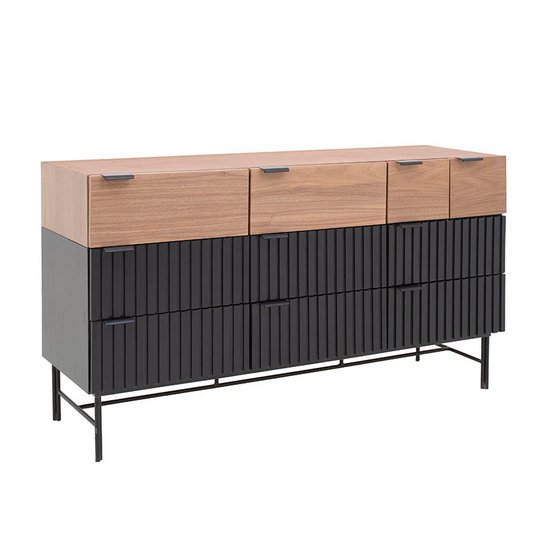 Experimenta el lujo del almacenamiento con la Cómoda Jess. Fabricada con madera industrializada y madera de pino enchapada en nogal, ofrece una combinación de elegancia y calidad. Las bases y jaladeras metálicas aportan estabilidad y modernidad. Con esta cómoda, tendrás todo el espacio que necesitas para tu ropa, manteniendo un ambiente elegante y ordenado en tu dormitorio.ctico y elegante.