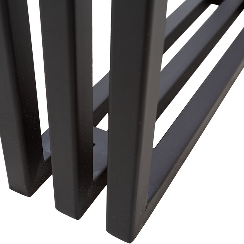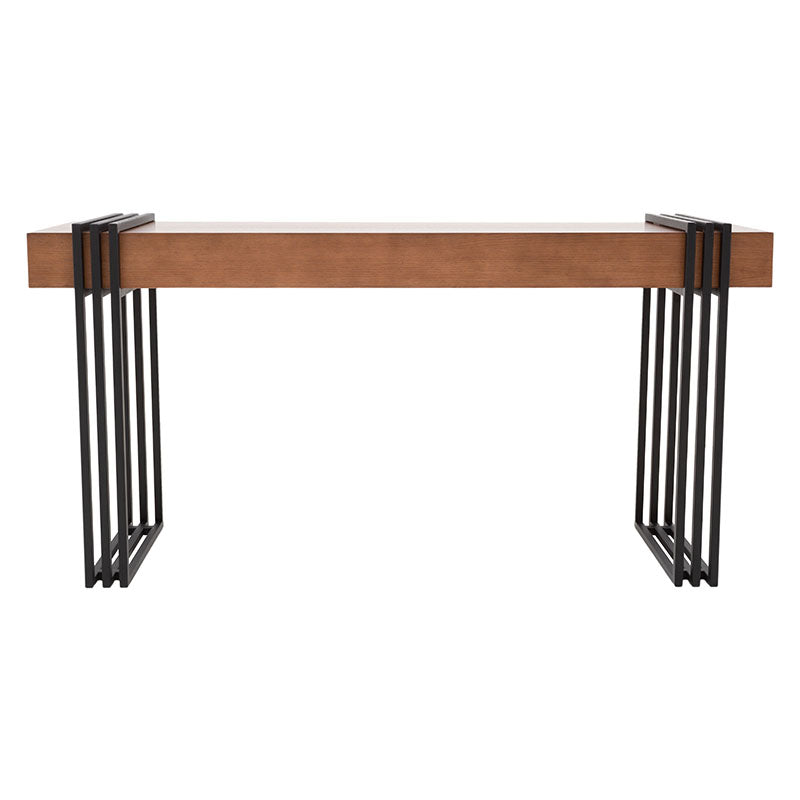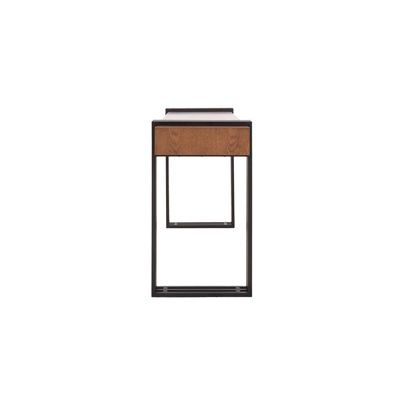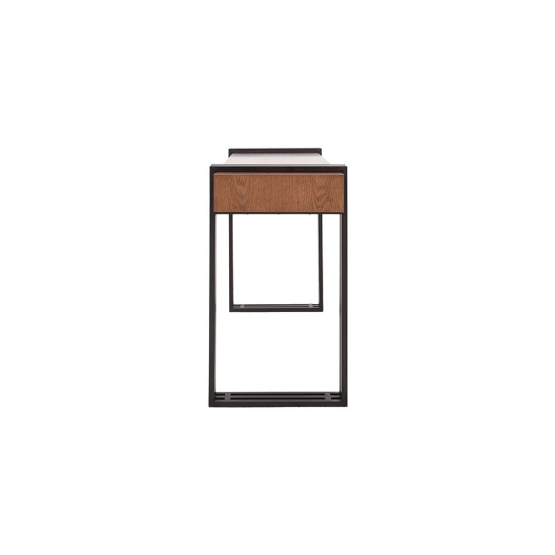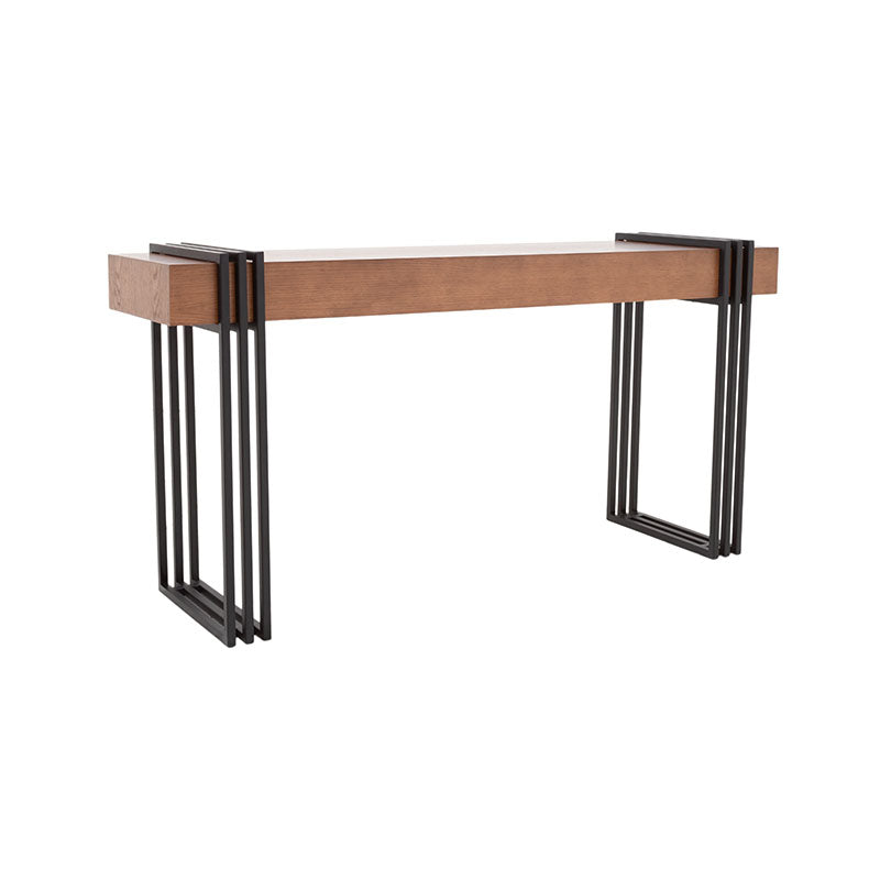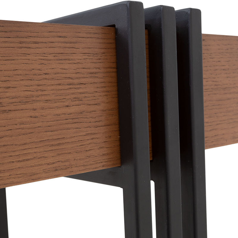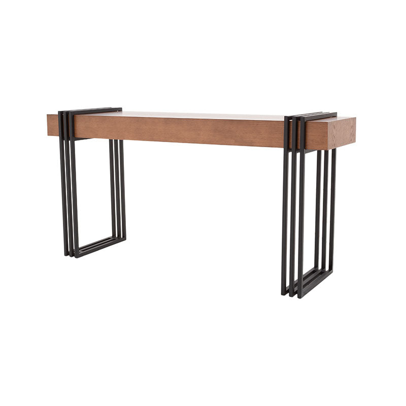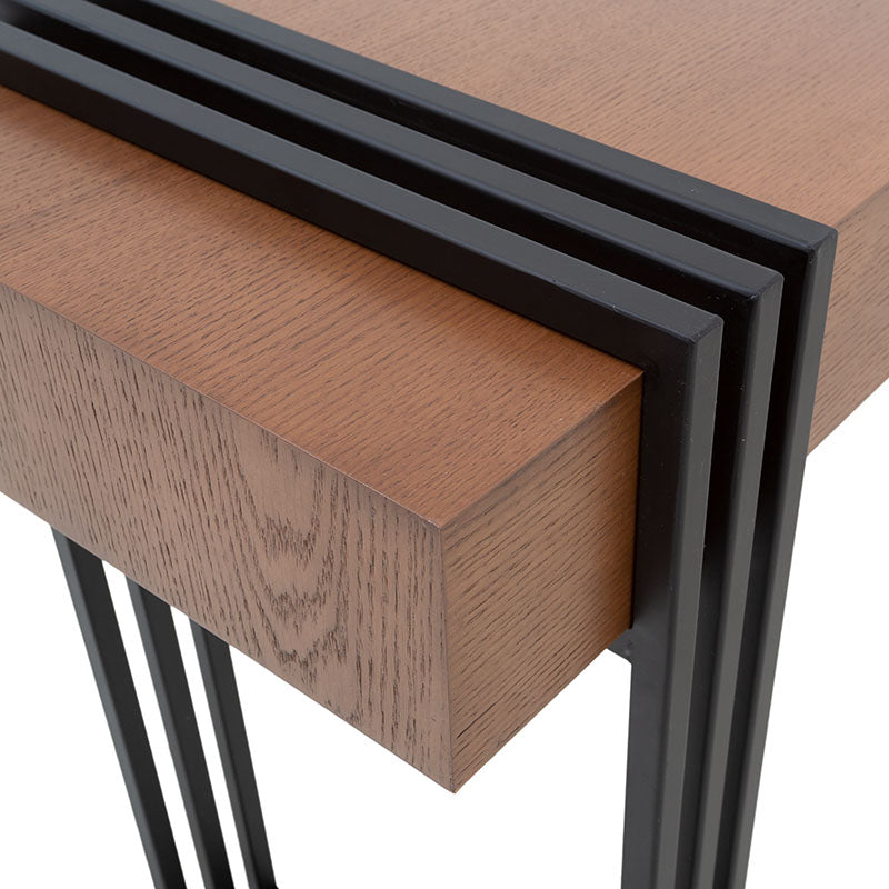 Esta elegante consola Bennet cuenta con una estructura de metal en un audaz tono negro, que aporta estabilidad y un toque urbano. Su cubierta de chapa de encino en tono nogal agrega un toque de calidez y naturaleza a su diseño. No solo es un mueble para tu entrada o sala de estar, es una declaración de estilo y funcionalidad. Descubre cómo esta consola puede mejorar la estética y la organización en tu hogar con su diseño cuidadosamente equilibrado.