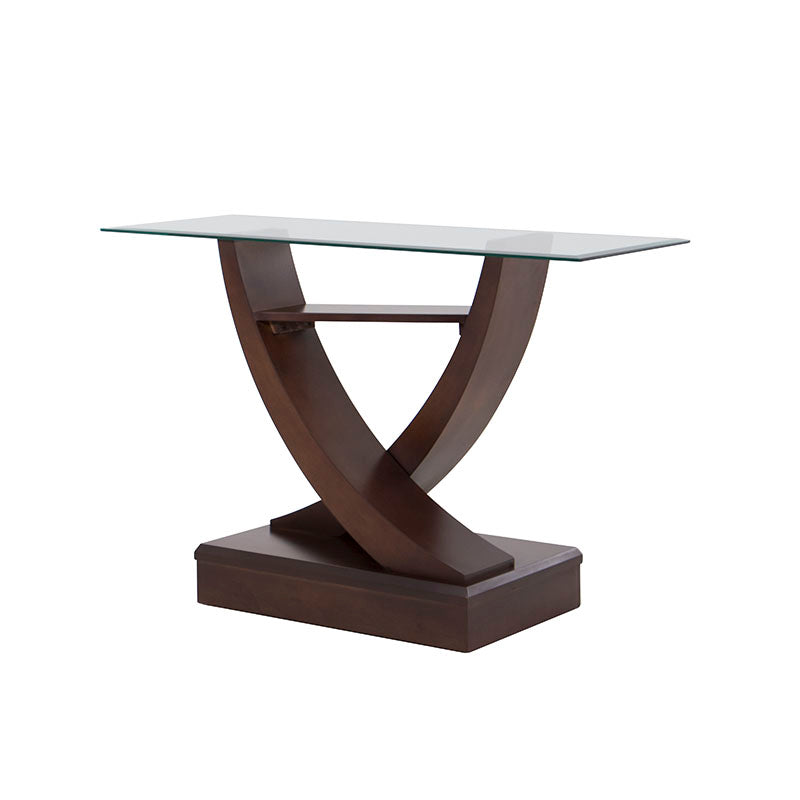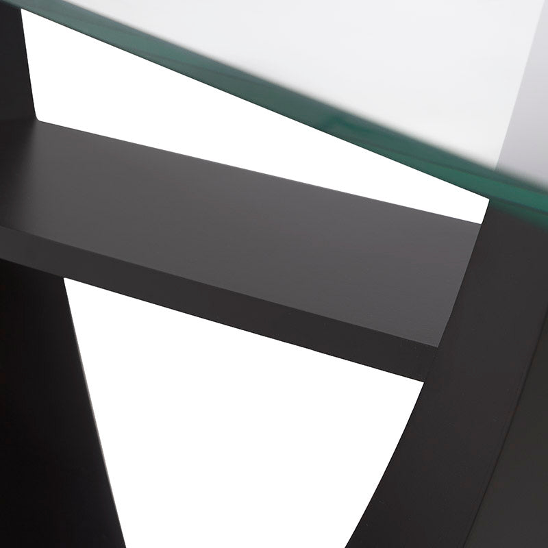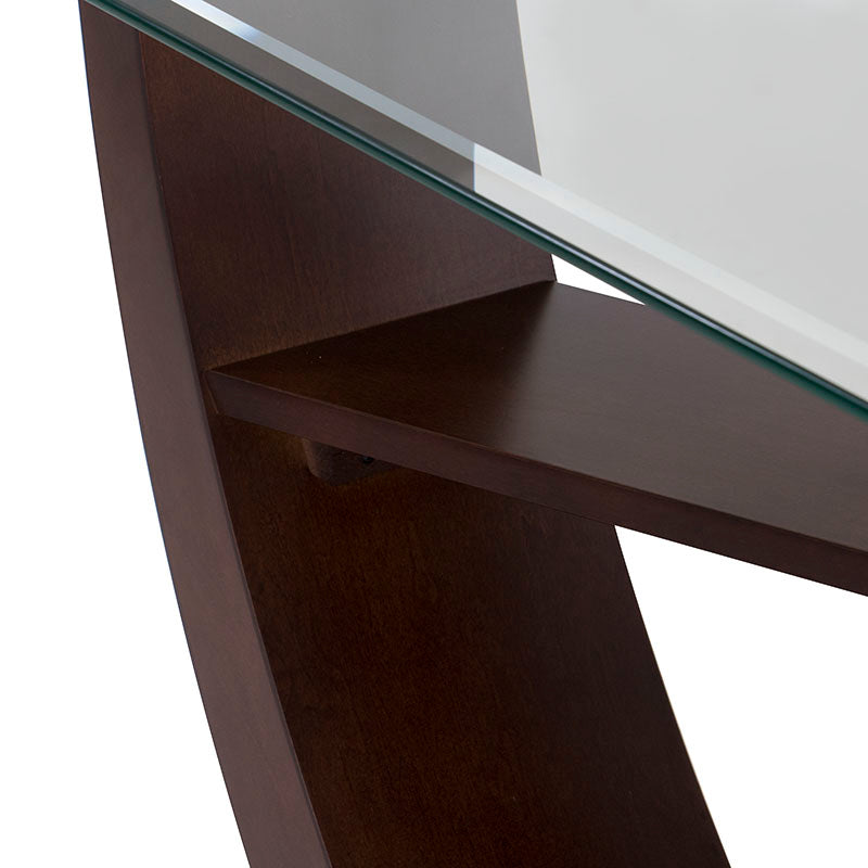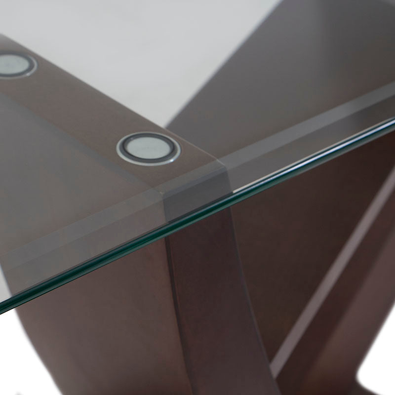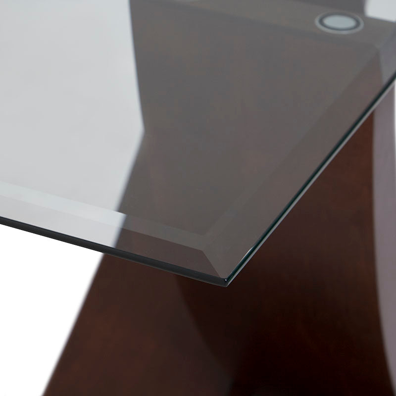 Fabricada en resistente madera de Hack Berry con acabado en nogal, su diseño se enriquece con una cubierta de cristal biselado que aporta luminosidad y modernidad.