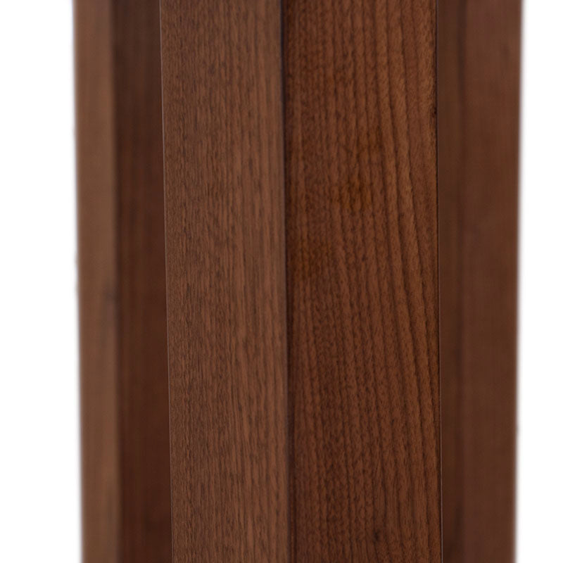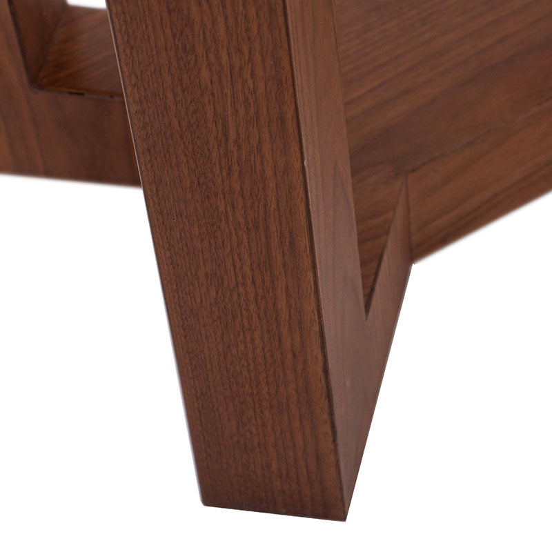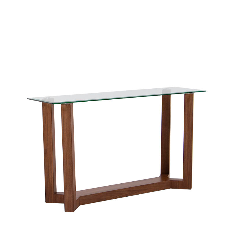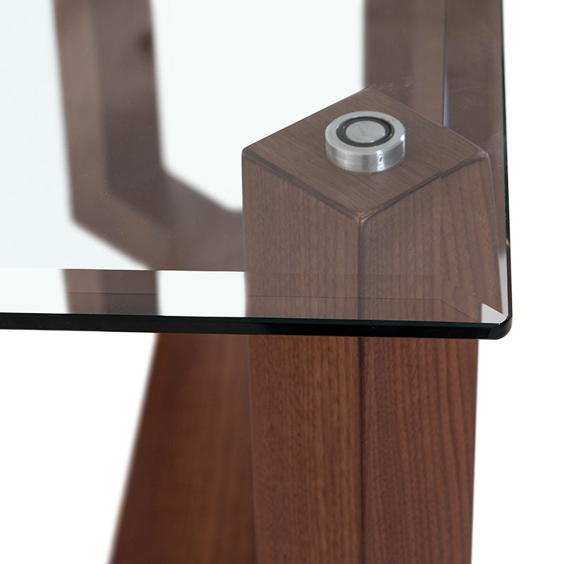 Su cubierta de cristal templado aporta ligereza y brillo, mientras que la estructura en chapa natural de nogal ofrece un contraste cálido y sofisticado, logrando un equilibrio perfecto entre funcionalidad y estilo.