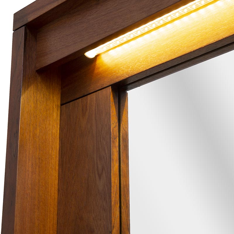 El espejo Bourbon lleva la elegancia a otro nivel con su diseño limpio y sofisticado. Con un acabado en color Tzalam y fabricado en madera de pino estufada, este espejo no solo es funcional, sino también la mezcla perfecta de estética y utilidad. Su iluminación integrada realza cada detalle y crea un ambiente único. Ideal para darle un toque moderno a tu habitación o vestidor.