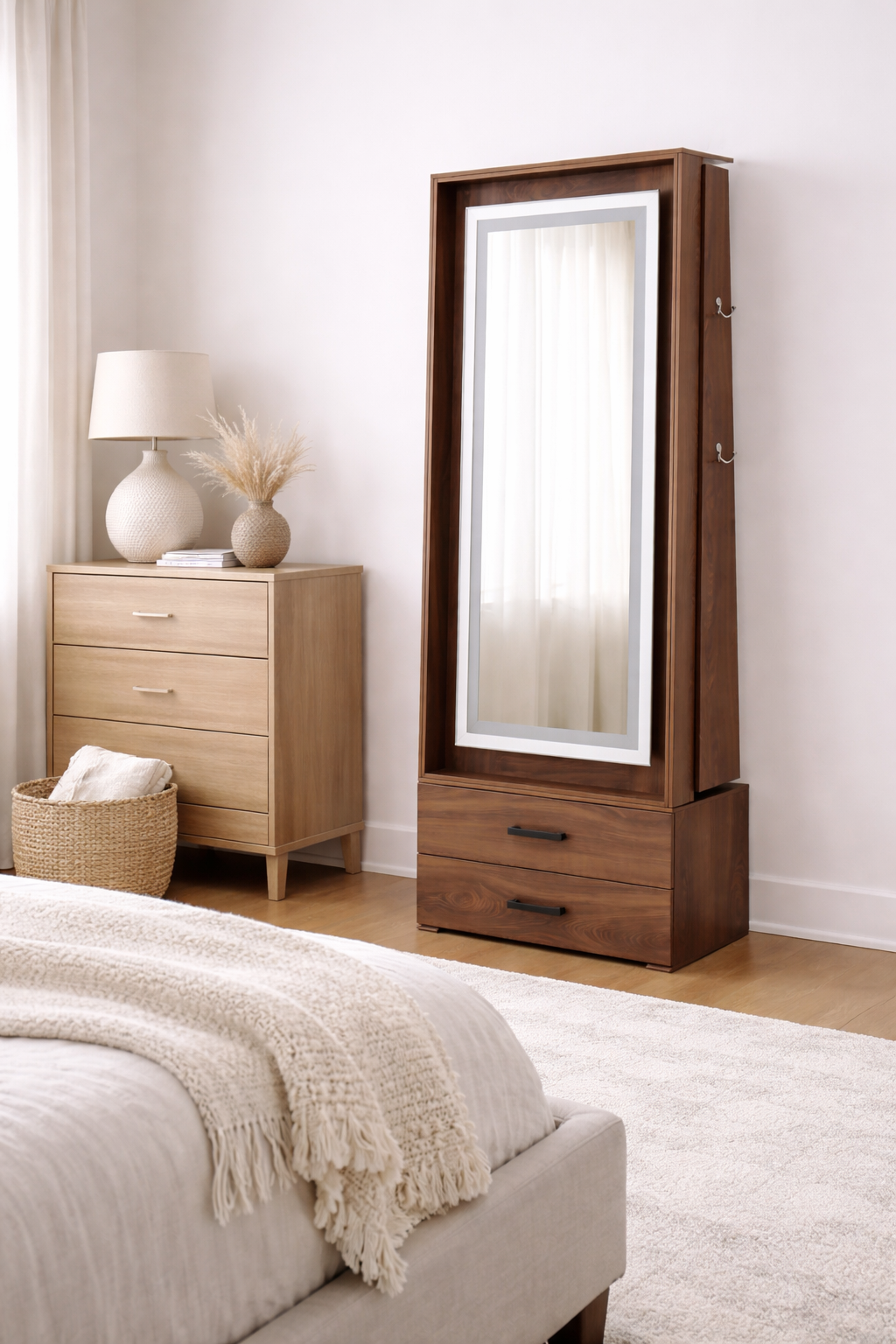 El Espejo de Pie con Luz Alejandría combina diseño contemporáneo y funcionalidad inteligente en una sola pieza. Fabricado en MDF procesado con acabado pintado, veteado y laqueado, integra herraje giratorio y bisagras tipo frog que permiten un uso práctico y duradero. Su iluminación integrada lo convierte en el complemento ideal para tu recámara, aportando amplitud visual, elegancia y un espacio funcional para tu rutina diaria.