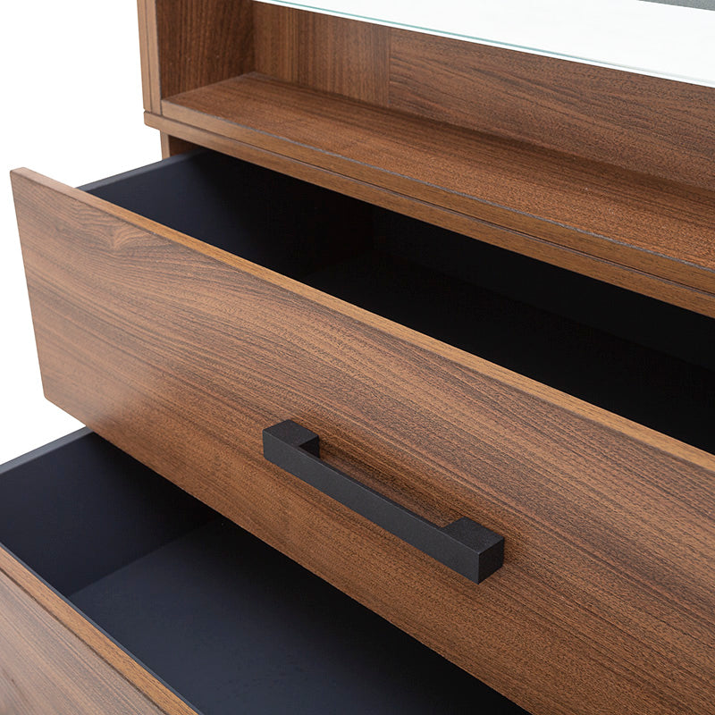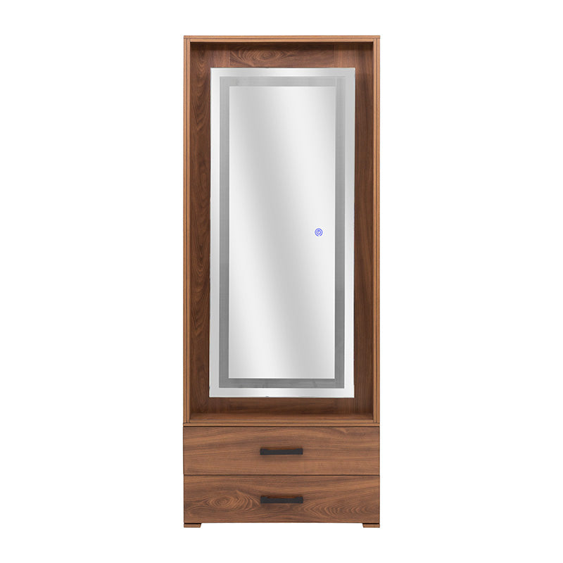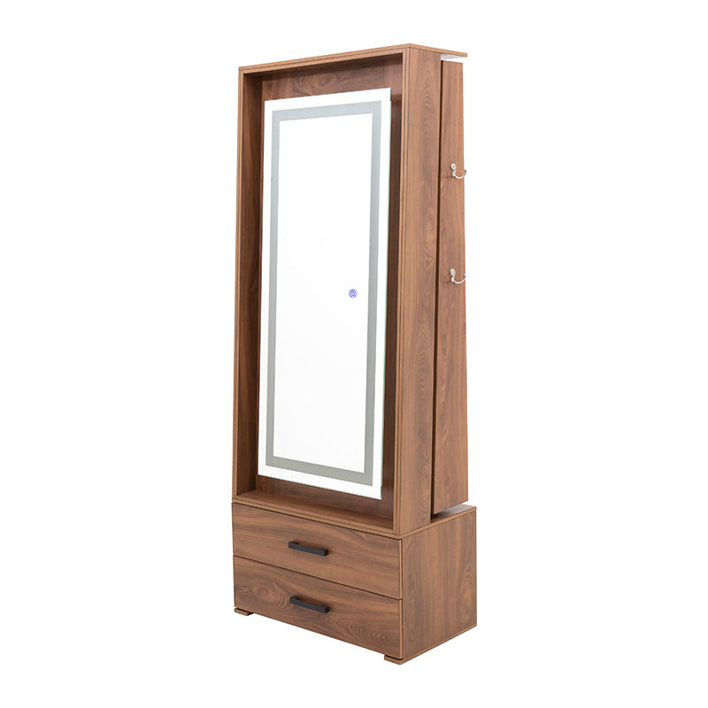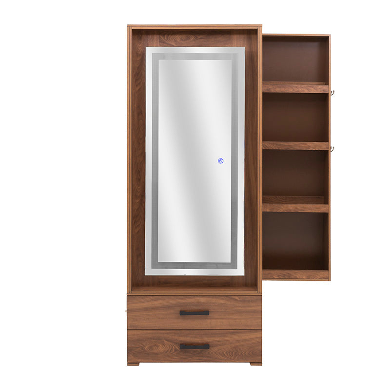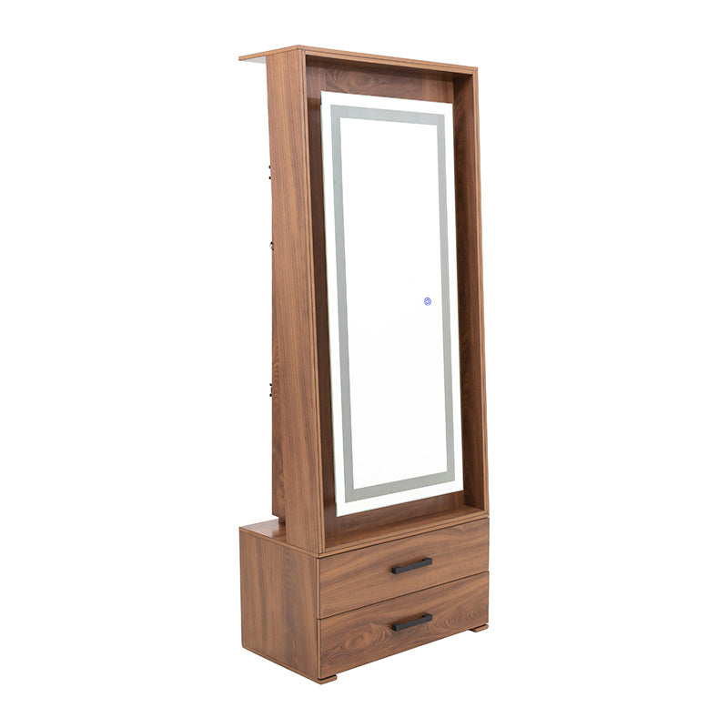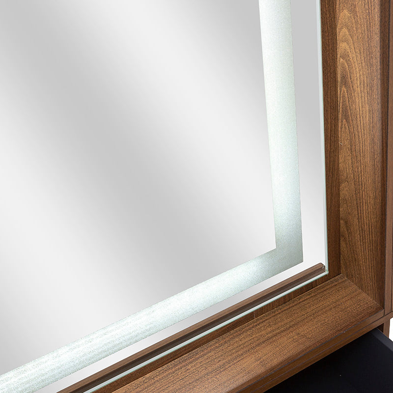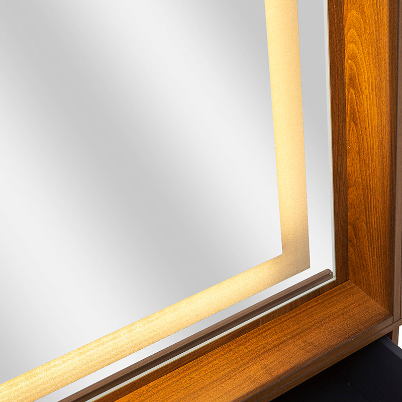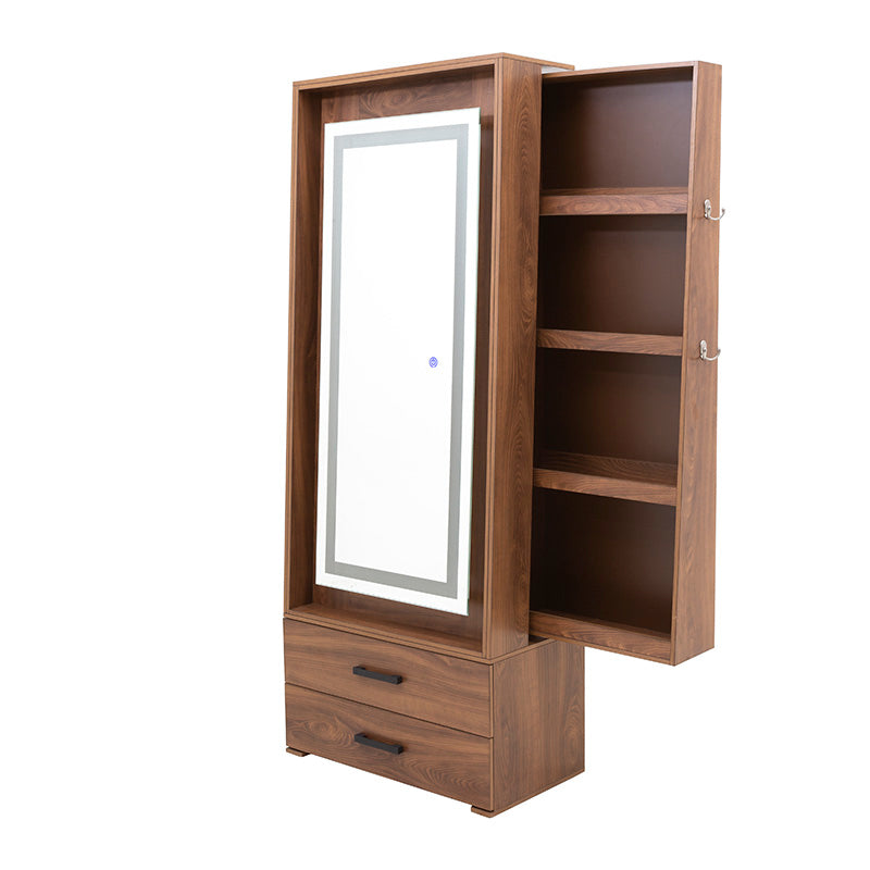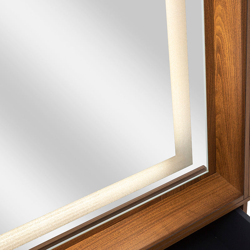 Su diseño contemporáneo incorpora compartimentos deslizantes ocultos y una iluminación integrada que realza cada detalle, convirtiéndolo en el aliado perfecto para tus momentos de arreglo personal.