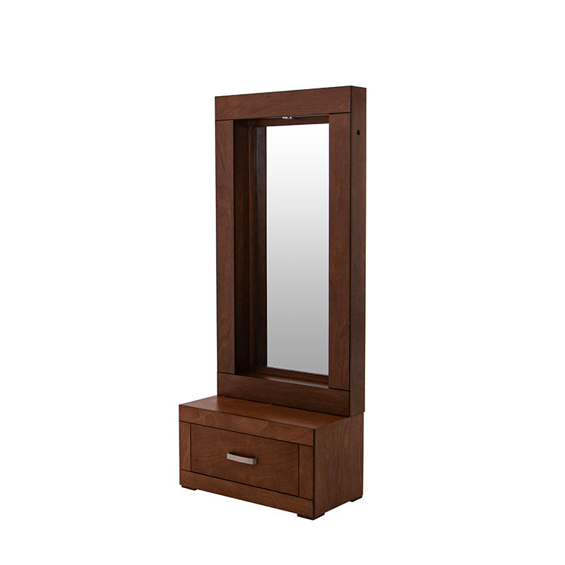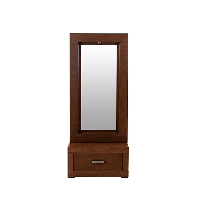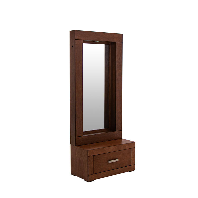 Fabricado en resistente chapa de okume en un elegante tono mandarina, este espejo de cuerpo entero no solo ilumina tu espacio gracias a su luz integrada, sino que también ofrece la practicidad de un cajón para mantener tus accesorios siempre a la mano.