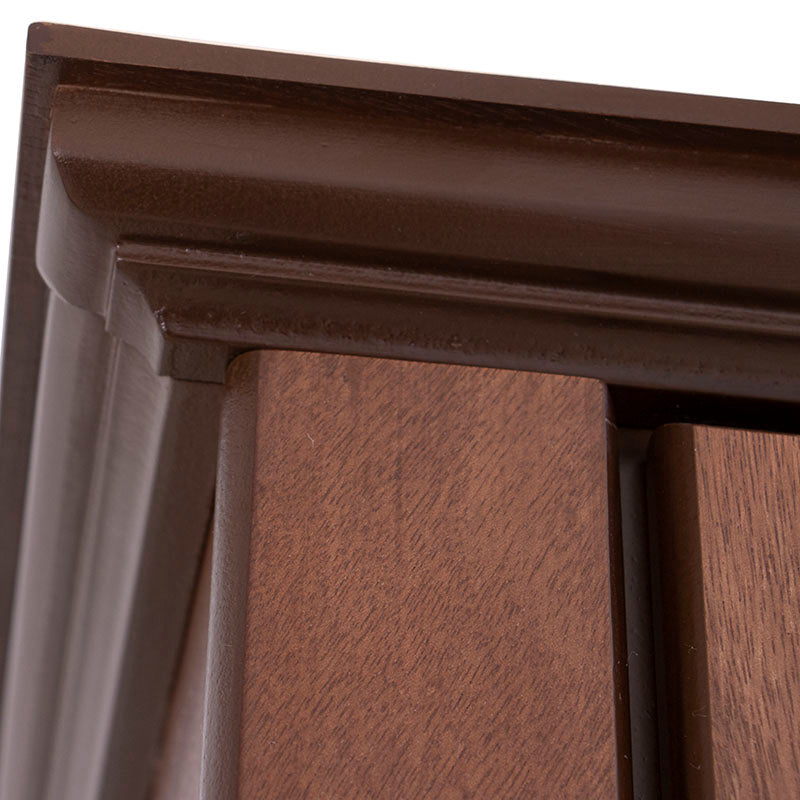 Fabricado en madera industrializada enchapada en okume, su acabado cálido y natural aporta un aire sofisticado al ambiente.