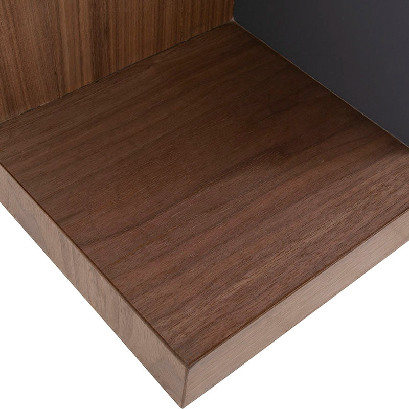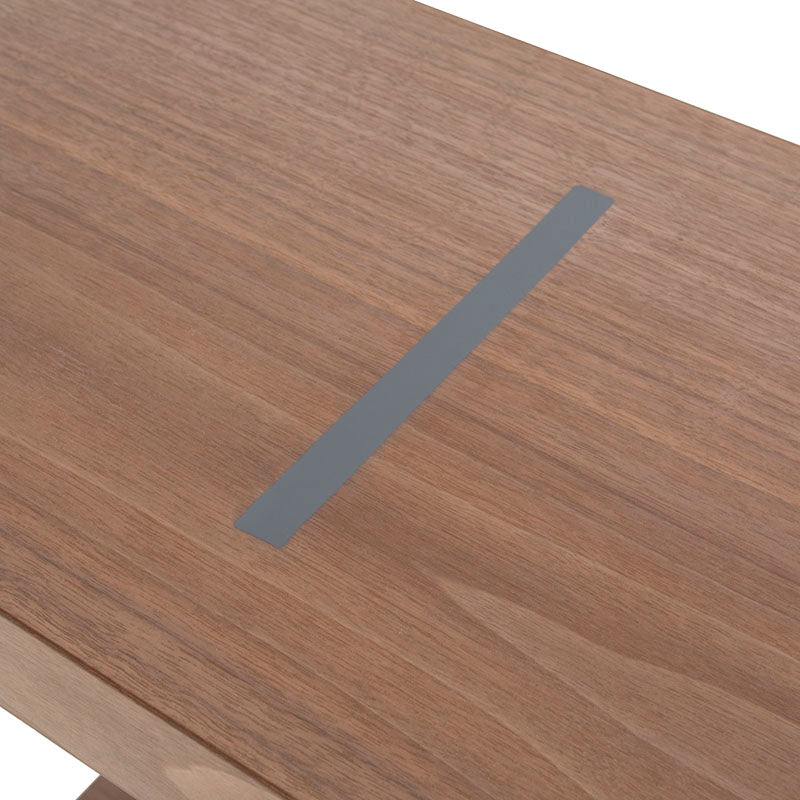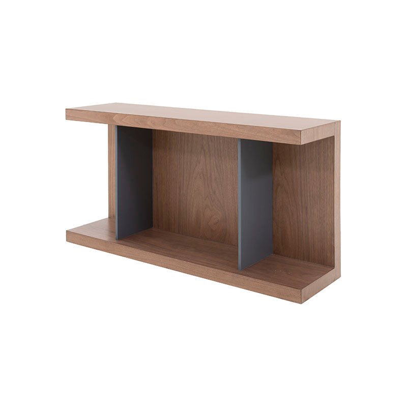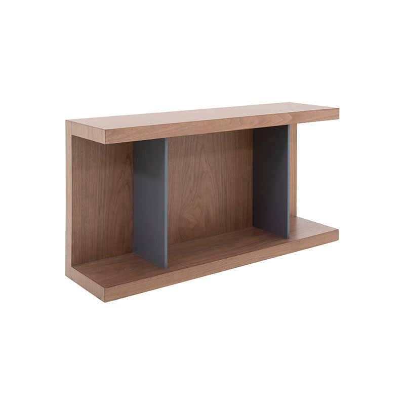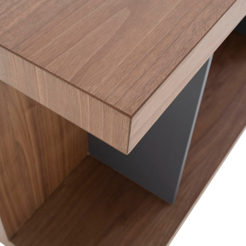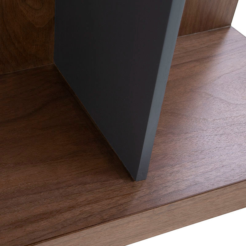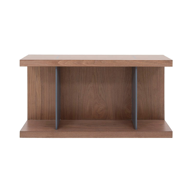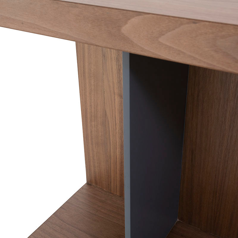 Su diseño bajo, elaborado en chapa de nogal y madera industrializada, aporta un aire cálido y contemporáneo que se integra fácilmente en salas modernas y espacios multifuncionales.