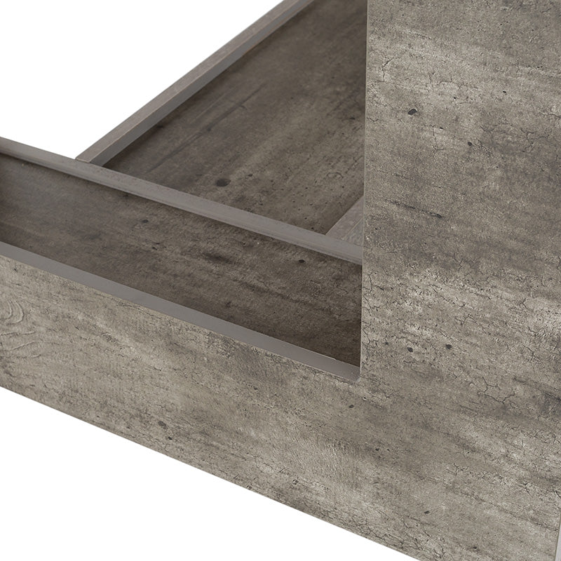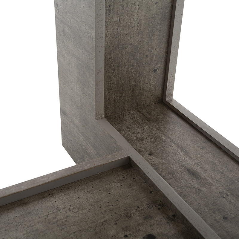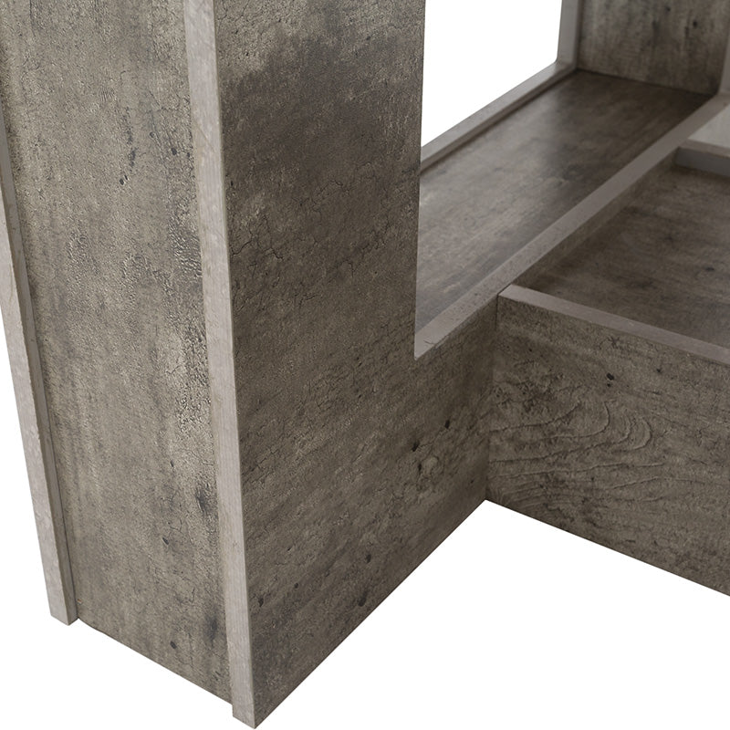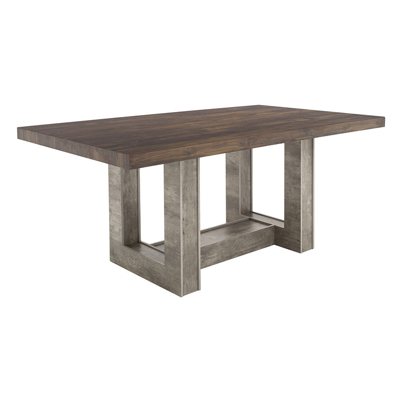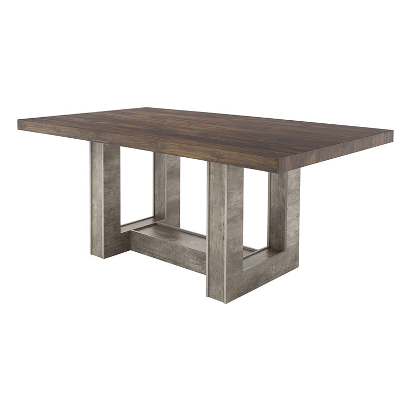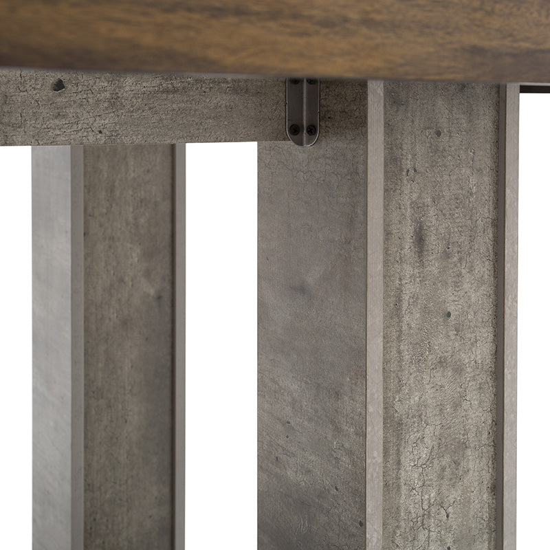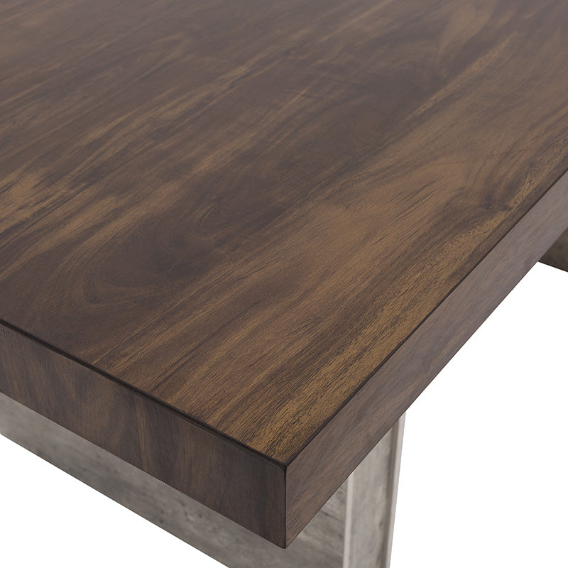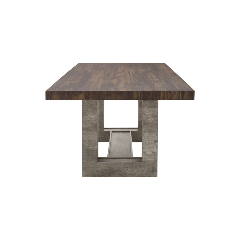 Su cubierta en madera de nogal resalta la veta natural, mientras que el pedestal en acabado gris concreto aporta un contraste contemporáneo que la convierte en el centro de atención de cualquier espacio.