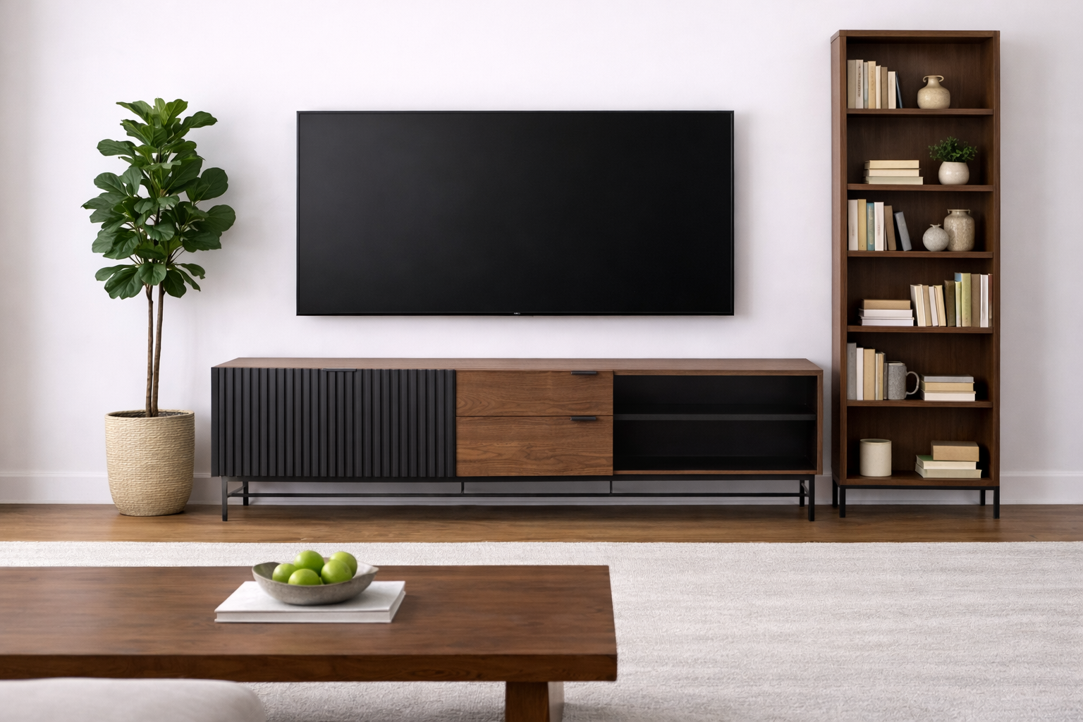 El mueble para TV Jess combina madera de pino enchapada en nogal con detalles metálicos para un estilo moderno. Su diseño inteligente incluye cajones y puertas para un amplio almacenamiento. Práctica y elegante, esta mesa es el complemento ideal para tu espacio de entretenimiento.