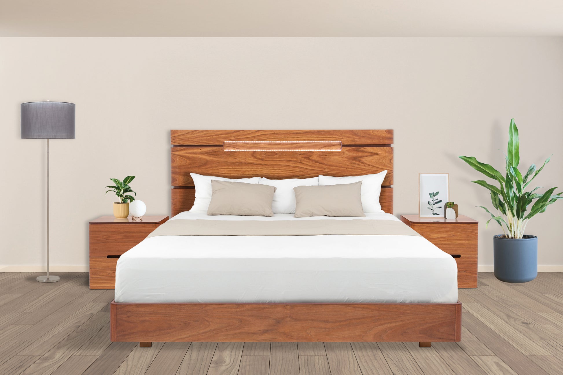 La cabecera King Size, con su elegante estructura en chapa de Tzalam y acabado natural claro, integra entrepaños laterales, lámparas y un sistema deslizante que transforma tus noches en una experiencia de confort y estilo. Acompañándola, un par de burós Arezzo sorprenden con su superficie de madera industrializada grabada —una verdadera obra de arte táctil— y un cajón oculto que aporta ingenio y practicidad sin comprometer la estética.