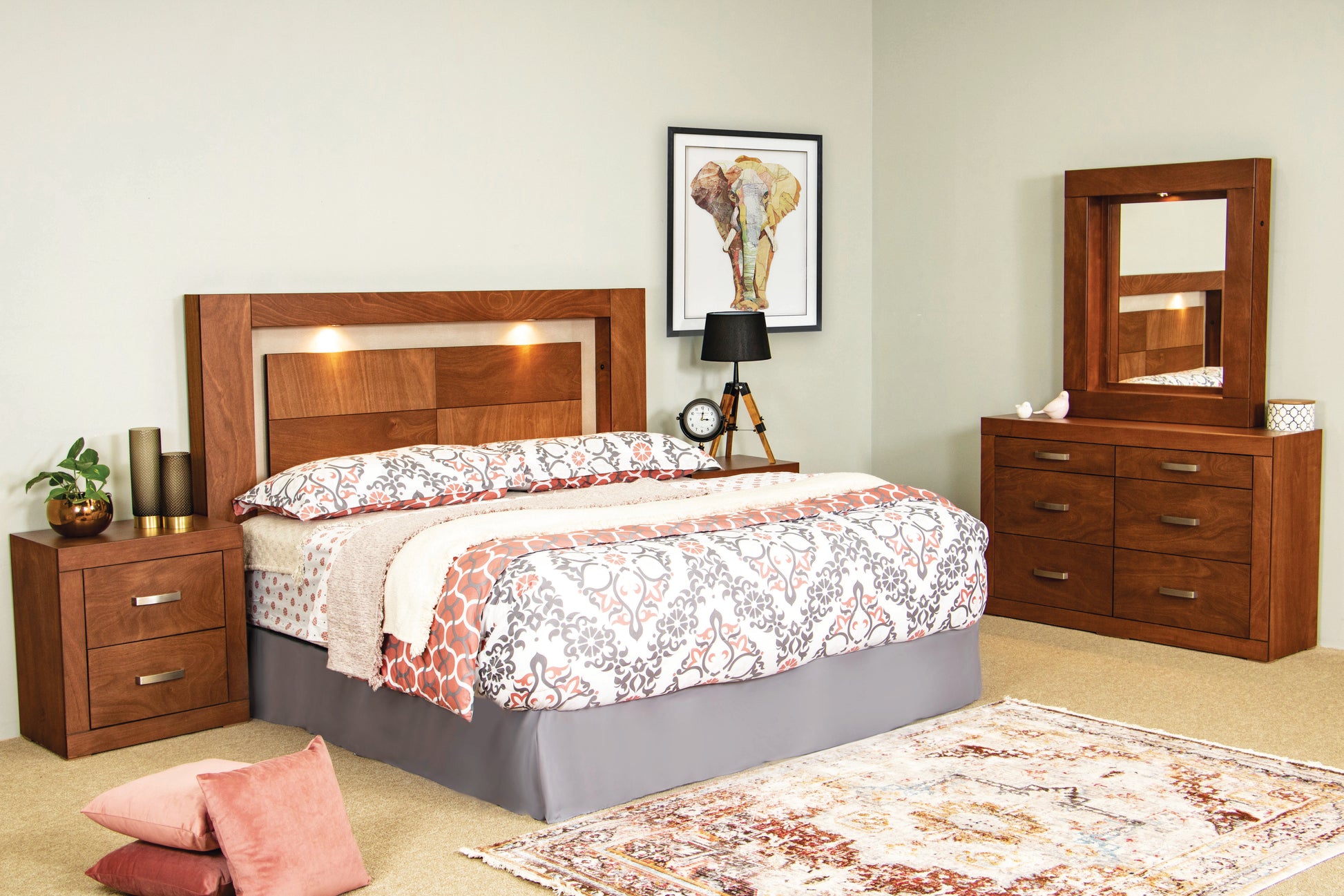 Cada pieza destaca por la calidad de los materiales y un acabado vibrante que aporta calidez y sofisticación. Ideal para quienes buscan una recámara con carácter y estilo único, la colección México convierte tu dormitorio en un espacio moderno y acogedor.
