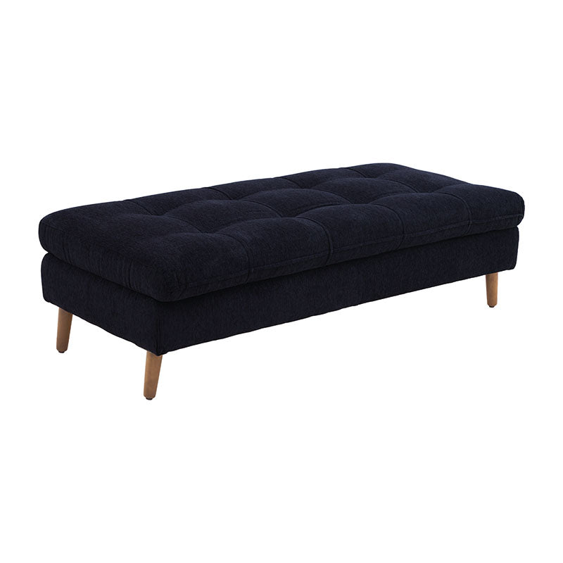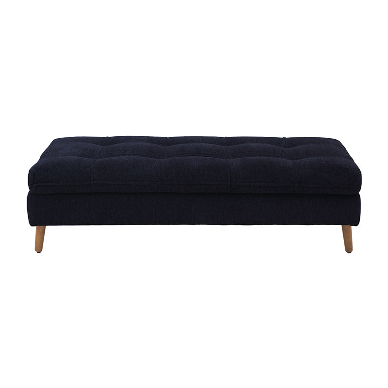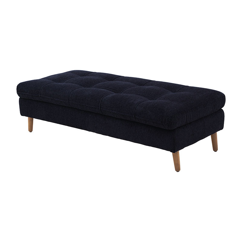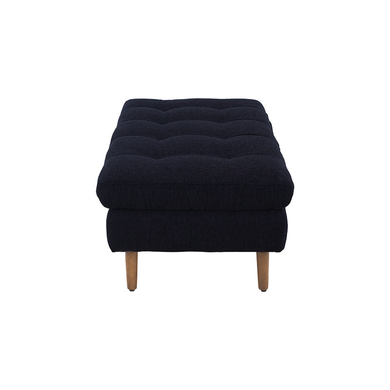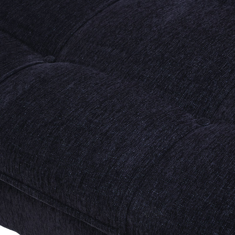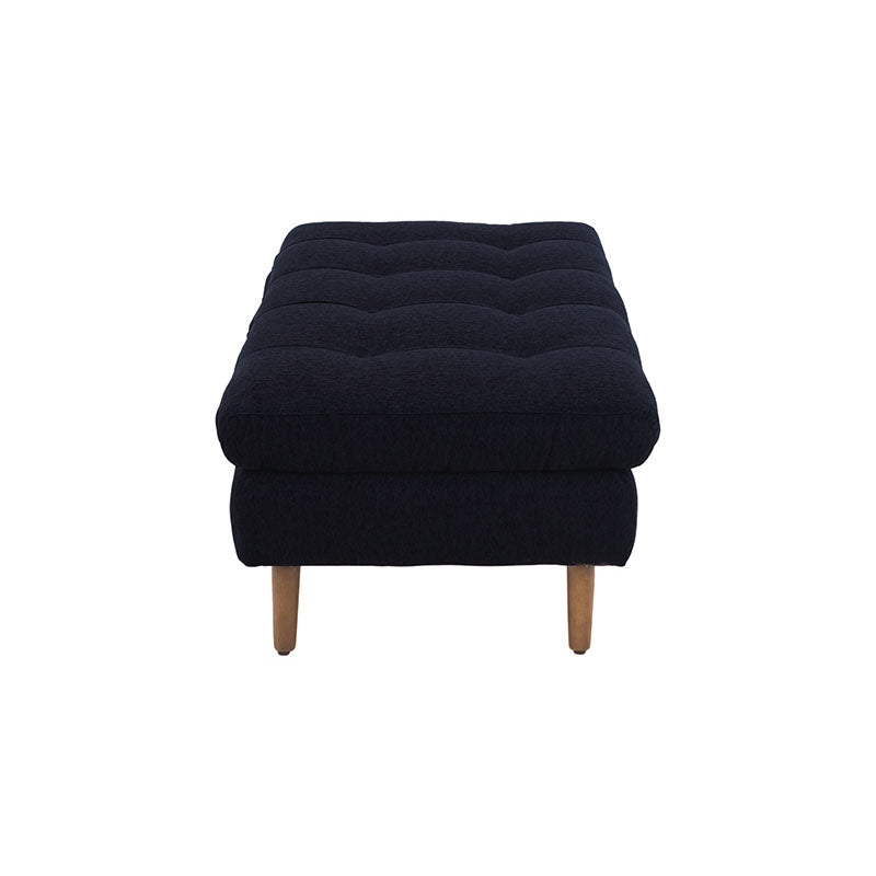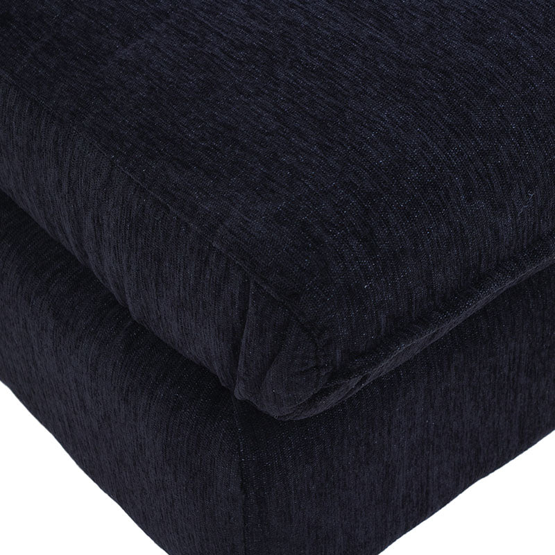 Haz que tu espacio destaque con el taburete complementario del sofá Eugenia. Su diseño minimalista, tapizado en tela negra de textura afelpada, encaja a la perfección con el sofá principal, creando un conjunto armonioso. Úsalo como un cómodo reposapiés o como un asiento adicional que se integra con estilo en cualquier rincón.