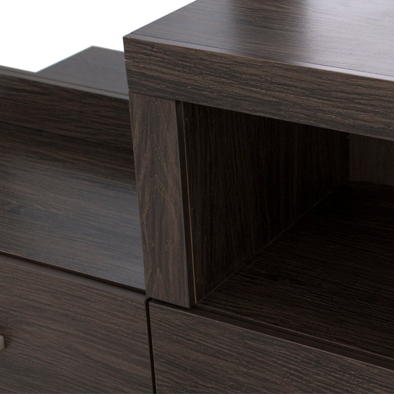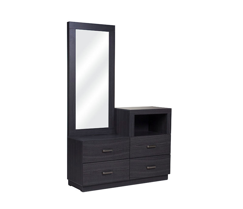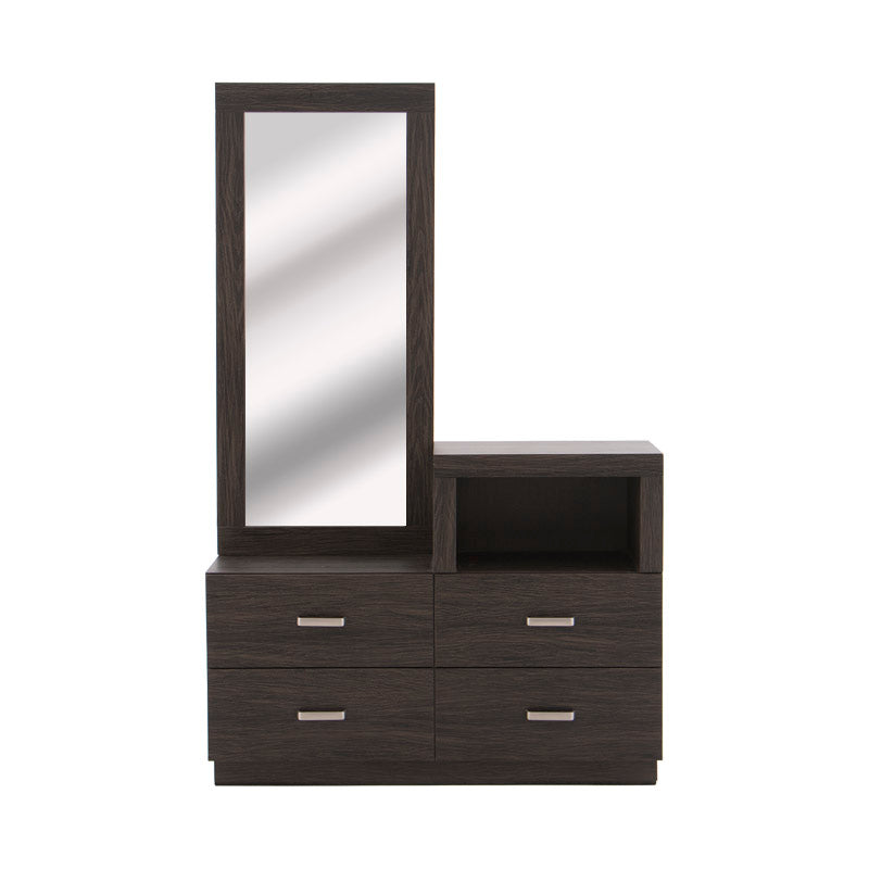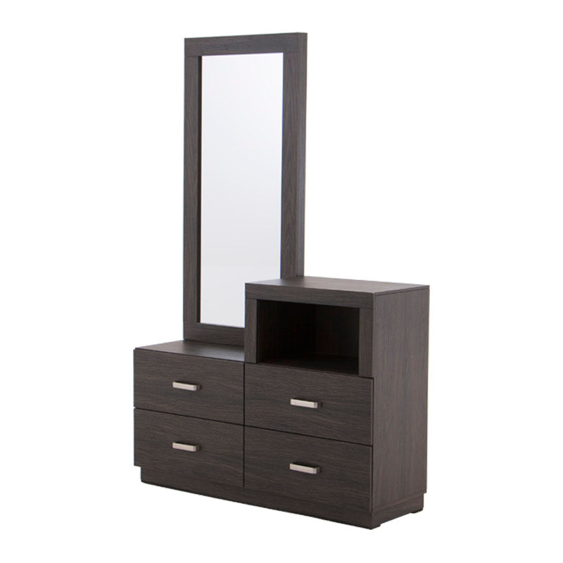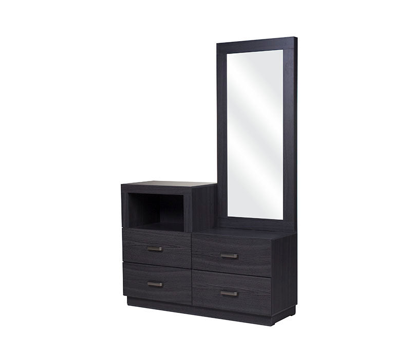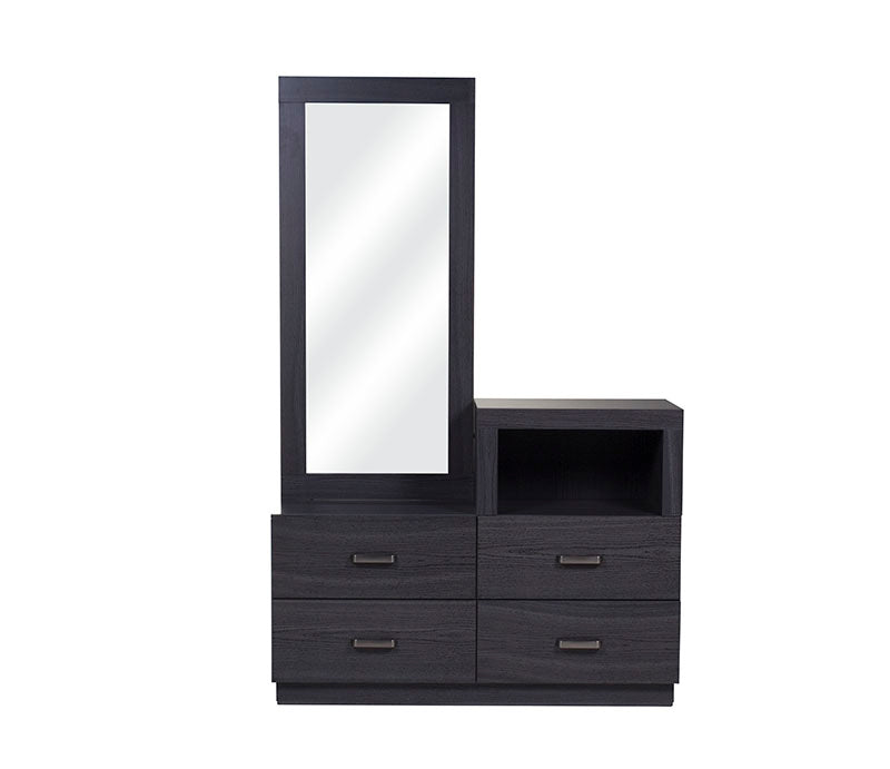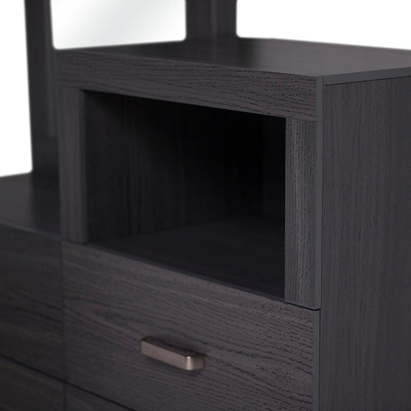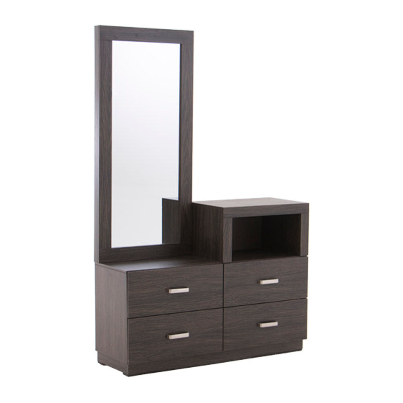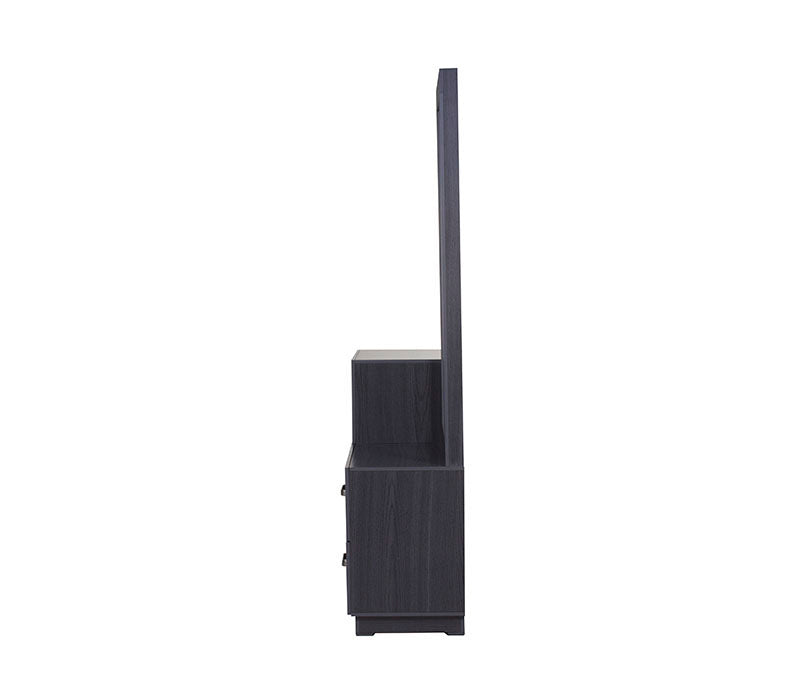 El tocador Olcen es una pieza de diseño moderno que fusiona elegancia y practicidad en un solo mueble. Elaborado en resistente madera industrializada con acabado grabado en tono gris, este tocador aporta un estilo contemporáneo y sofisticado a tu recámara.